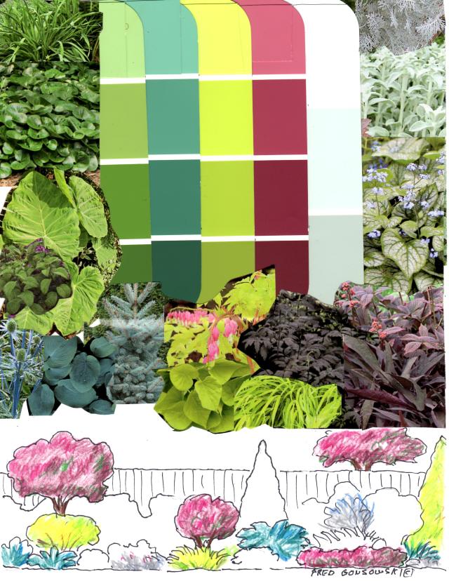 Next look at the illustration of the garden. The concept that I want to relate to you here, is about working the different colors of foliage across a garden and even around your property. First look at how I took the burgundy color of the foliage and worked it from the small tree on the left side of the drawing, to the bush in the center of the garden. Then it shows up again at the edge of the border and finally it appears as the color of the tree in the neighbor’s garden.