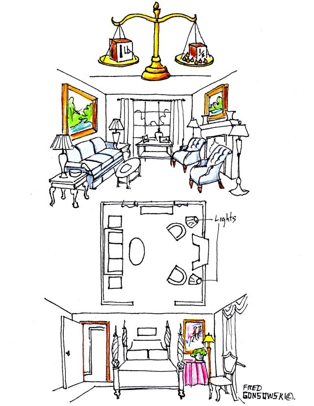 Interior decorating is a lot like a two-sided scale. When you have a two-sided scale, your objective is to have equal balance on both sides. Look at the first drawing in the illustration for this post.