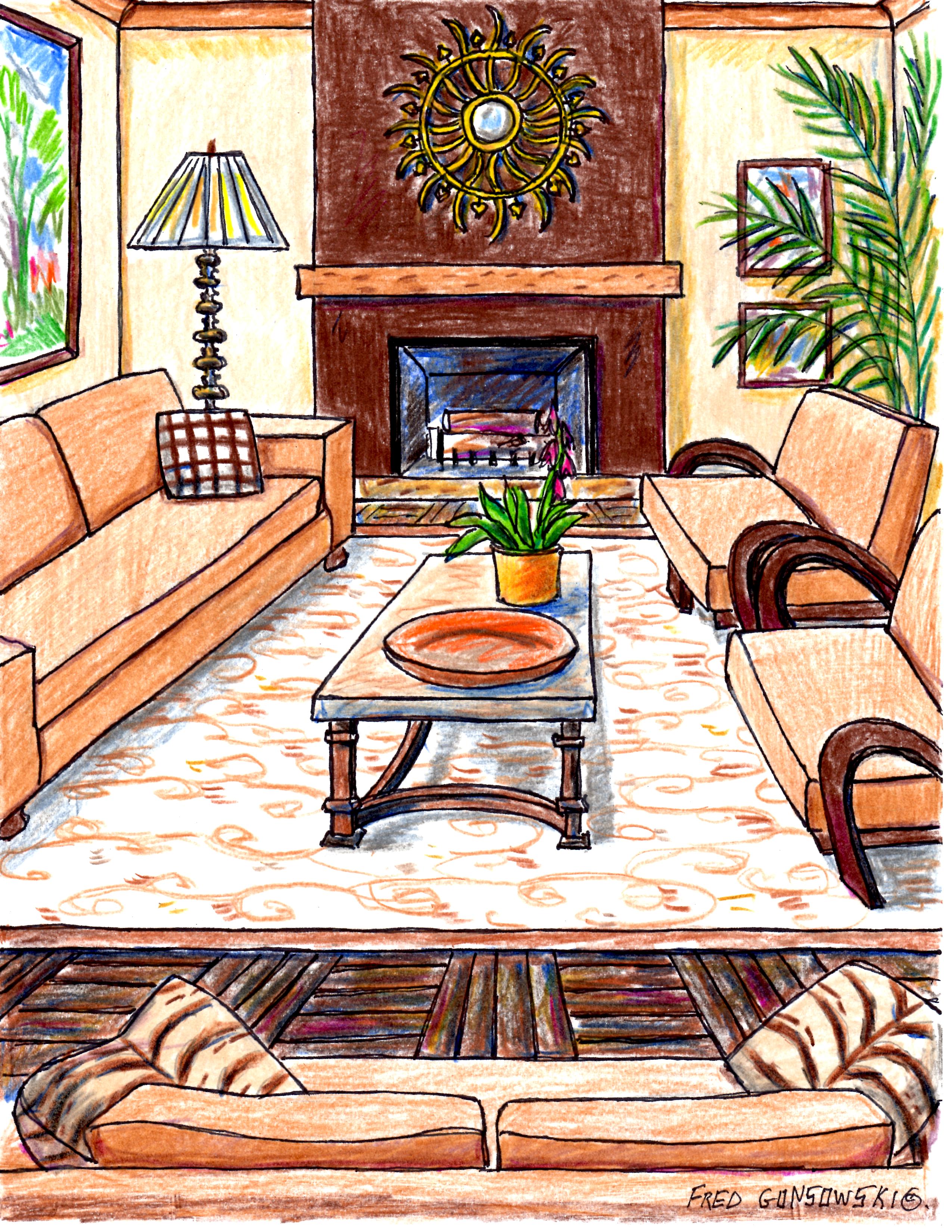Now look at the illustration of the living room. Besides using different tones of beige, from dark to light, this illustration show how color is moved across a space. Notice how the dark brown starts on the focal point wall around the fireplace. It then moves to the checkered pillow on the sofa, and proceeds to the arms and legs of the two chairs on the right side of the room. The dark brown then works its way to the stain on the wood floor, and ends up on the two pillows on the sofa at the bottom of the illustration. When decorating a room is all medium, or light tones of beige, Dark Tones (colors) for wood furniture, need to be added to anchor the room. The dark colors add visual weight, otherwise it would be too light and airy, and float away.