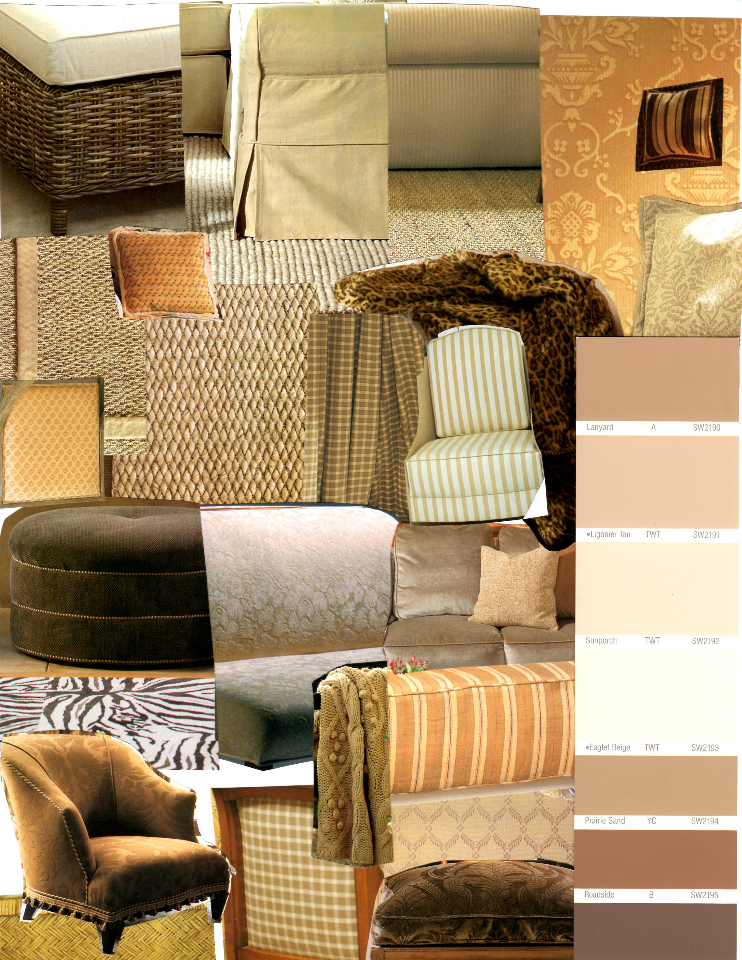Now look at the second visual. The first collage shows a paint strip with all the different colors that make up a single color family. The first collage also shows many different fabrics, and floor covering option, in a variety of tones and textures in beige. Notice how I placed strong-bold patterns and textures next to subtle-weak patterns and textures, so the different pattern combinations don’t fight each other. Also, look at how I moved the dark brown color of the wicker, on the piece of furniture on the top left of the collage, down the left side of the visual, and worked it up the right side. Just like I did, when I worked the dark brown around the illustration of the living room.