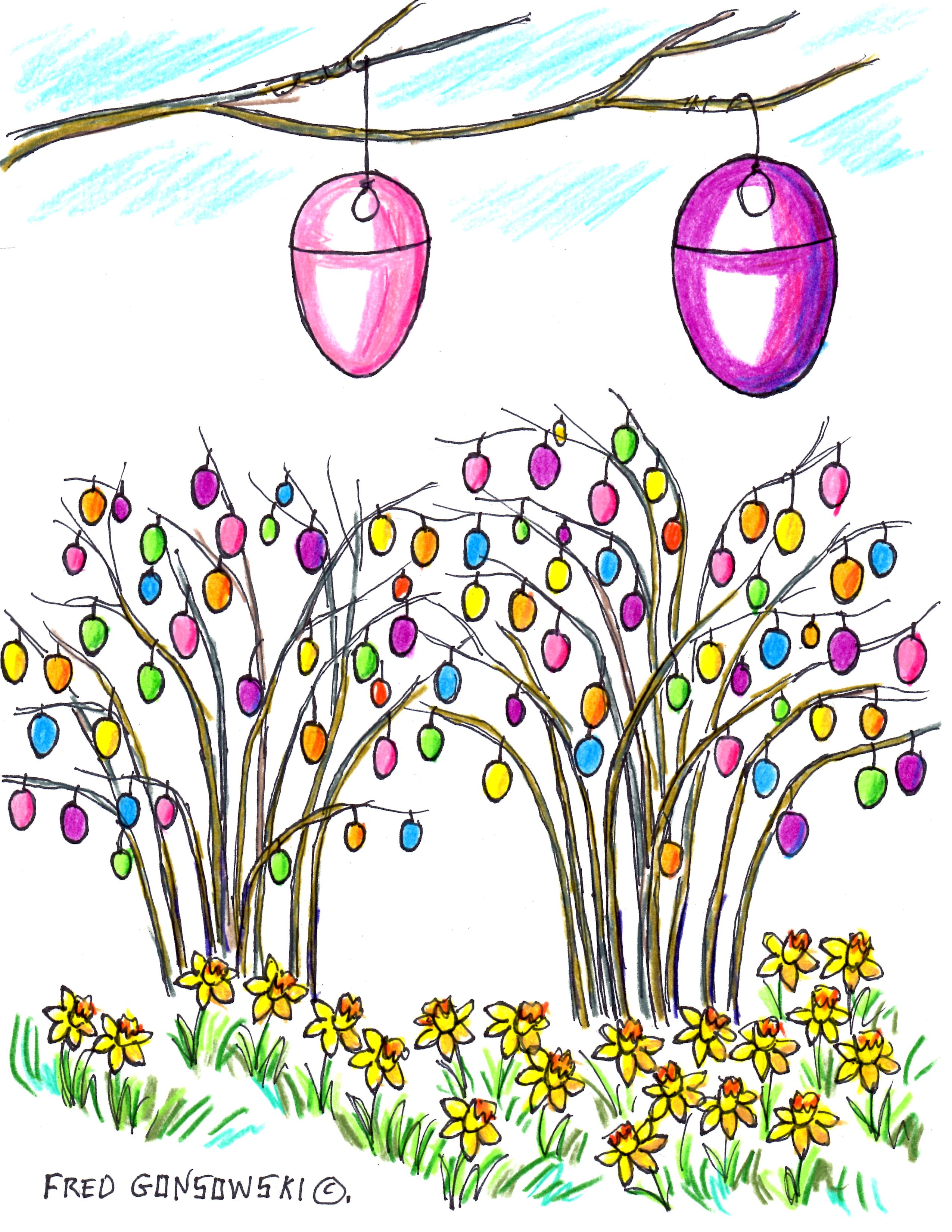 Now the fun part! Go and decorate a bush or tree. You can even attach them to evergreen foundation plants. If you don’t have a bush to decorate, think about possibly cutting a branch from the woods, and wiring it to a lamp-post by your front door; then decorate that. What a wonderful welcome to all who come to visit. If you don’t have an outdoor space to decorate, you can make an Easter egg tree for indoors. Buy branches at a florist or craft store, if you need to. Place then in a heavy vase or urn. Secure with stones if necessary, and Decorate.