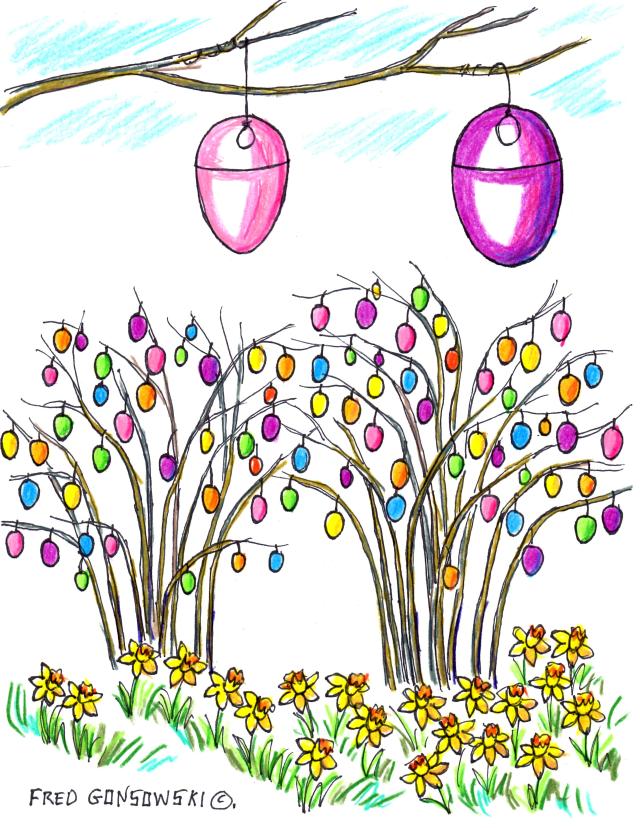 Now that St. Patrick’s Day is over, and hopefully Winter is waning??, there is nothing more visually exciting than seeing an Easter Egg tree or bush, set against the still taupe tones of deciduous trees, bare of their leaves. I think seeing a bush or tree, covered with Bright-Happy colored plastic eggs is something everyone finds to be a welcoming site. I yearly decorate two bushes, down by the road, with hundreds of assorted sized eggs, that people can see as they drive by. It’s easy to decorate a tree with eggs. If you are interested in doing it, you will only need a few supplies to get started.