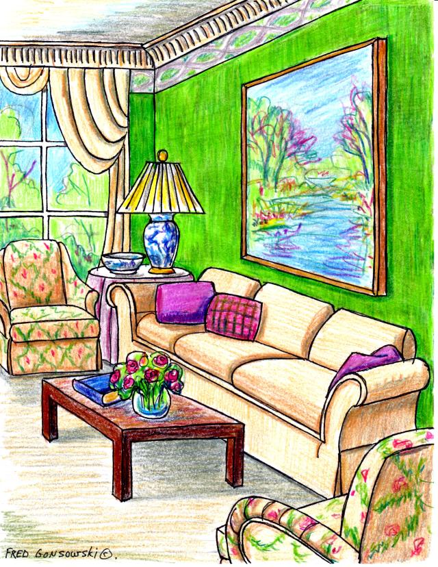 When it comes to carpeting, sofa and chair fabric, pillows, throws, etc., again thing light and bright! Pick whites, creams, golds, pastels, and bright pastels. Stay away from dark jewel toned colors.