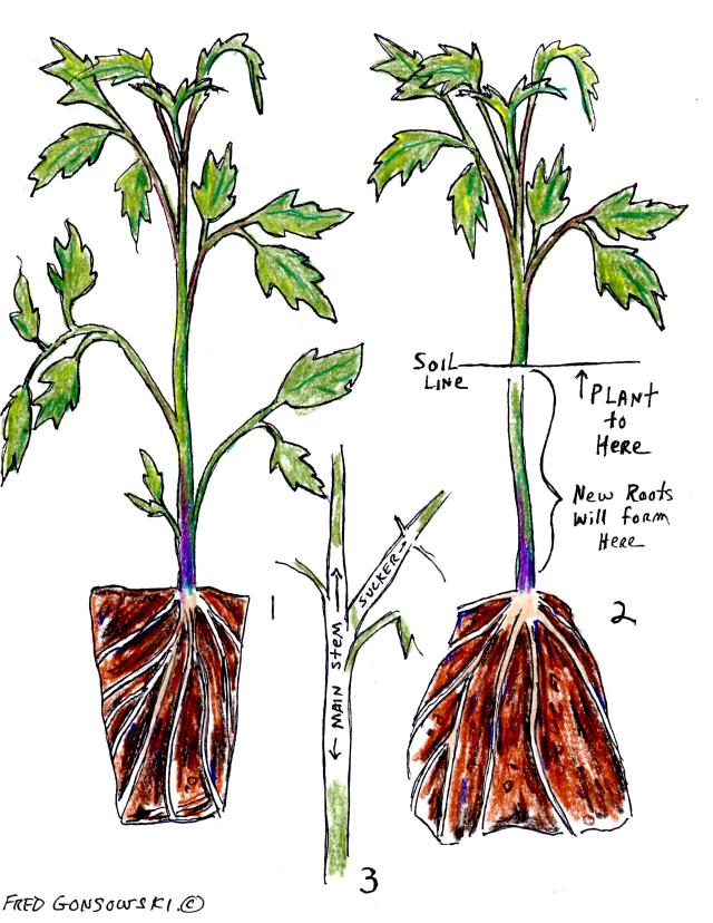 Now look at the illustrations. Illustration 1 shows a tomato plant, the way it looks when you buy it. Illustration 2, is the same plant showing how the root system was pulled apart to promote better root development. The tomato stem without its leaves, and the level at which it should be planted.