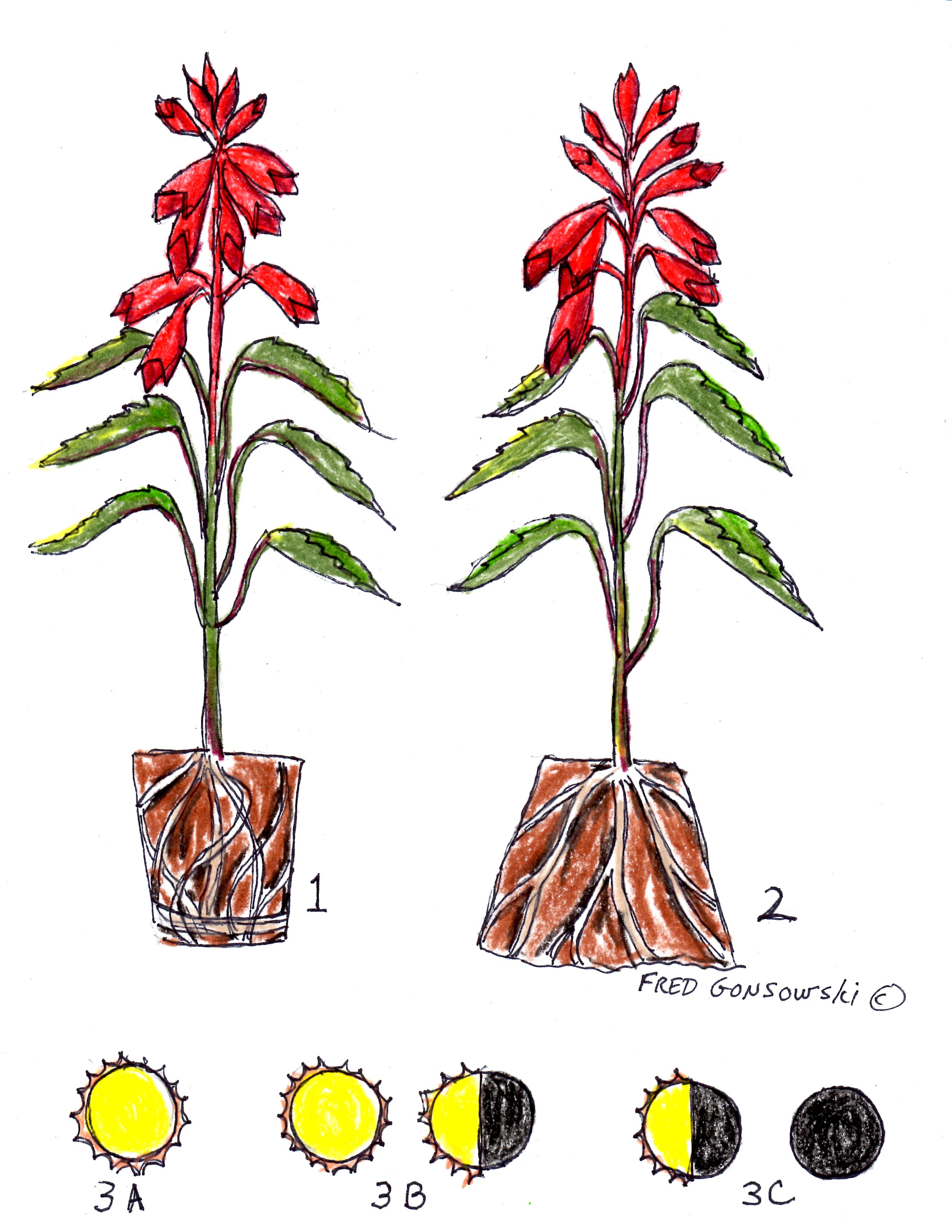 Look at illustration 3. It shows the different light conditions a plant likes. This kind of light chart is on most/all plant tags when you buy annuals. 3A …The full yellow sun is 6 plus hours of direct sun each day. Think south-west exposure from 11AM to 4PM. 3B …is full sun to partial shade. That could be full sun from 6AM until about 11AM. This is like a garden with an eastern exposure planted by a house. 3C …is partial shade to full shade. This is shaded areas on the north side of a house, behind big bushes, or under trees, where light is filtered. Full Shade is a tricky one. No plant really wants/can survive in the complete absence of light. If you think about the deep woods, not many plants grow under the trees. All plants need some kind of light, even reflected light to keep living.