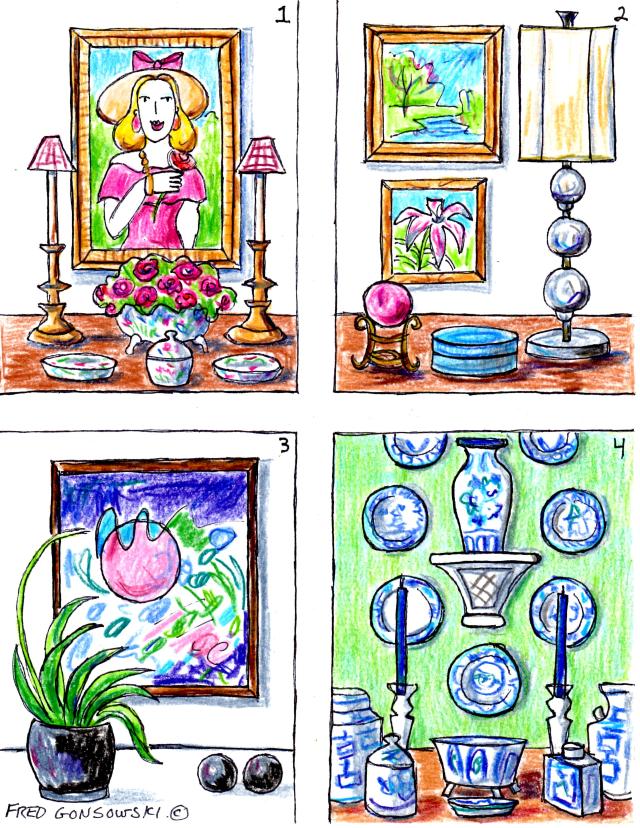 In my June 7, 2011 post titled “Arranging Your Decorative Accessories (Knickknacks and Collectables), I tell you how to make a tablescape. I cover the different heights elements should possess for an interesting display. Now that you know how to do that, I want to tell you about combining the tablescape, with an arrangement of wall decor hung up behind it, to make an even more visually interesting statement.
