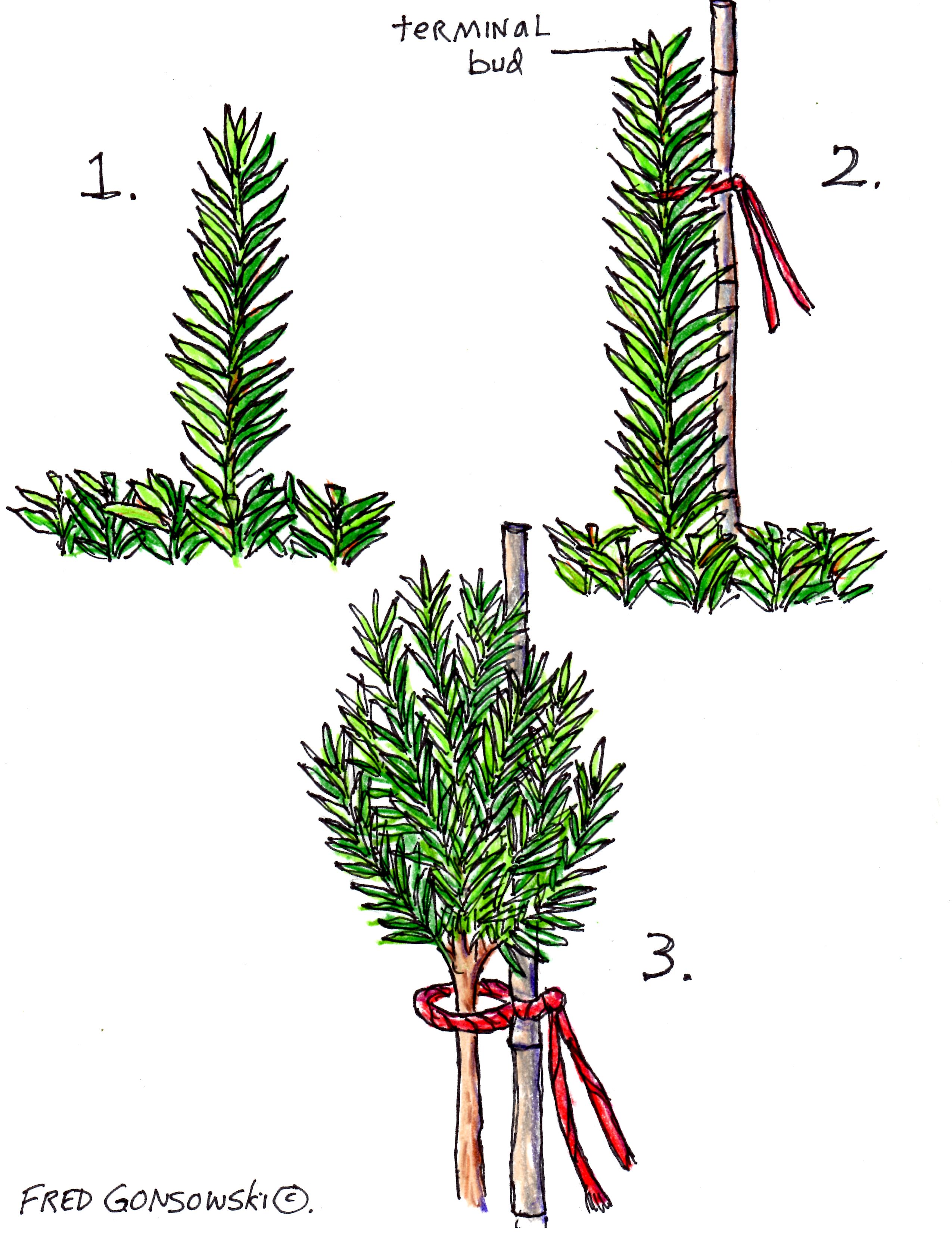 Step 2 .. Stab a bamboo stake 12 to 18 inches taller than the new growth tip into the center of the yew, and into the ground, as close as possible to the new shoot. Now let it grow. As it grows, loosely tie it to the bamboo stake with a piece of jute, to protect it from being whipped by the wind and damaged. (see illustration 2).