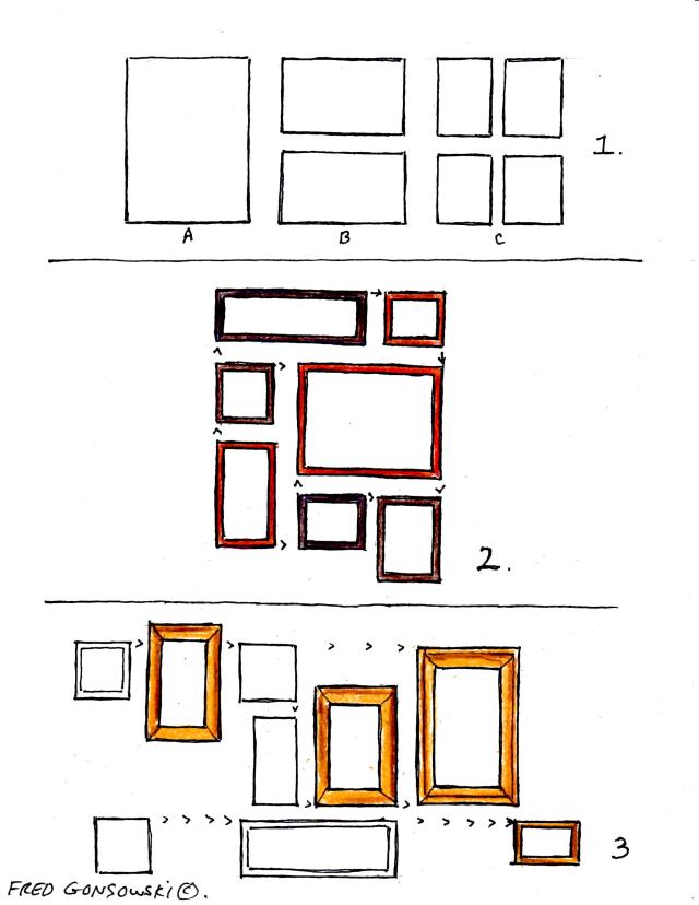 Now look at Illustration 2. Notice how I lined up the outside edges of the collection that represents a mass grouping of picture frames, with each other. I drew some arrows between each silhouette so you can see how the eye is directed from one frame to another, in either a vertical (upward), or horizontal (across) movement. When edges are lined up, no matter how large a collection of items is, there is a kind of controlled feeling (calm), not a chaotic display.