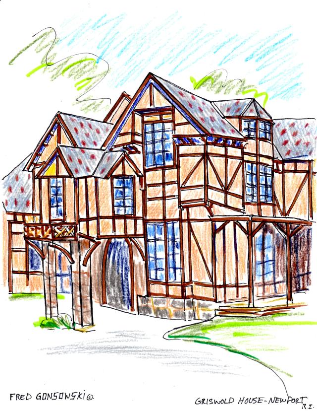 For years we’ve traveled to Newport, Rhode Island. Saturday mornings are spent at the Newport Art Museum, which is housed in Griswold House. Griswold House was designed by the famed nineteenth century architect Richard Morris Hunt, in the American Stick Style. The Griswold House has the most gorgeous slate roof, an artwork in itself, done in shades of russet-red and gray tones. A roof like that is a jewel, a starting point, that a color scheme for the facade of the building should be culled. Instead of pulling colors from the magnificent roof, and working them down onto the body of the house, they painted the facade in tones of medium-brown and a kind of chocolate-brown. The body of the house, does not, in any way enhance the fabulous roof, and the roof does not set off the colors chosen for the Stick Styled house.