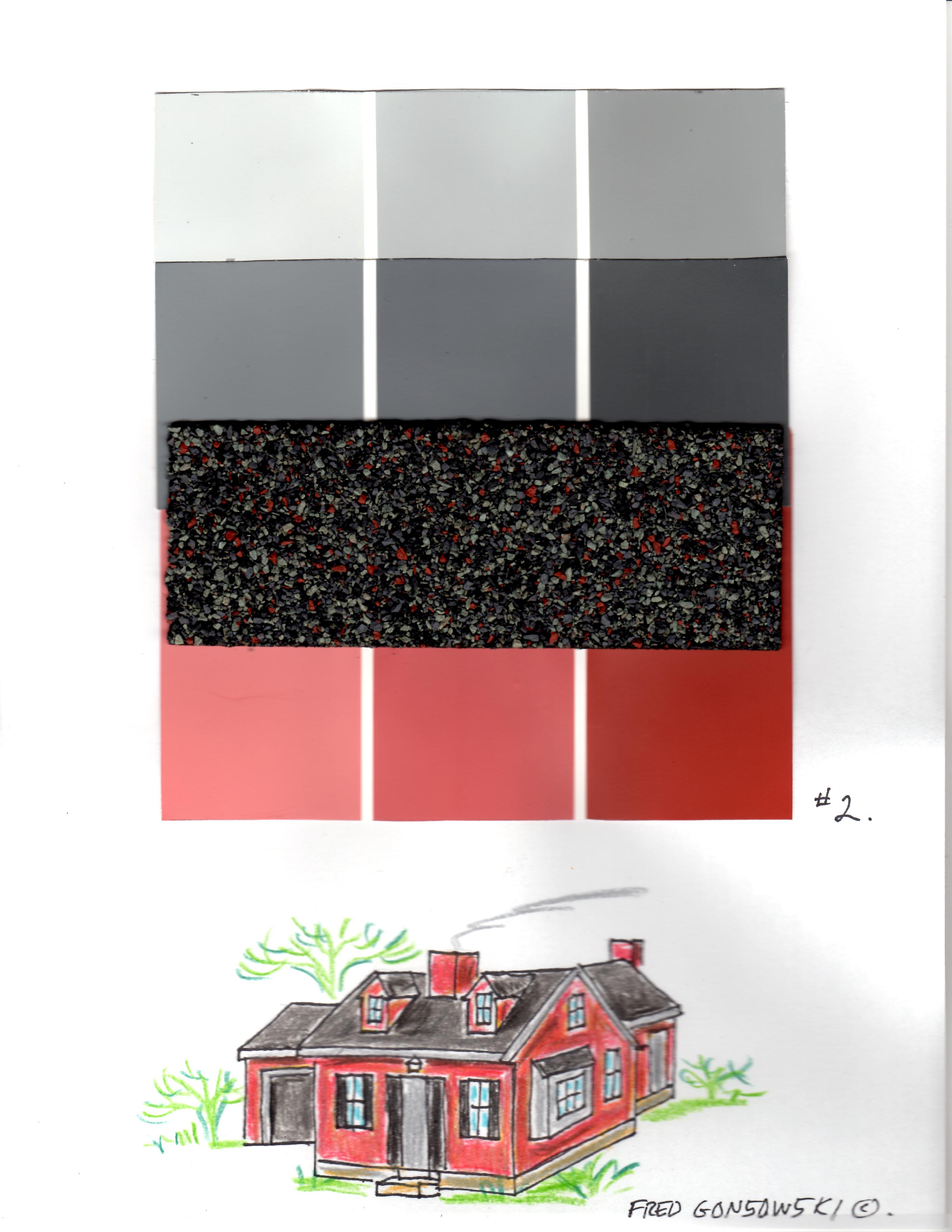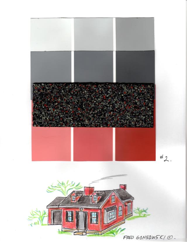 Now look at illustration #2 This roofing shingle is made up of sands that are dark, medium and light gray, along with a medium russet red. There are 3 easy options to consider. Option 1 (shown) is a red brick, or red painted facade, with light silver-gray for windows, doors and trim, and dark gray for shutters. Option 2 could be a white house, with russet red shutters and gray-black doors, or gray-black shutters and russet red doors. Option 3 could be a medium gray house, light gray trim and front door, russet red for the windows, and gray-black shutters.