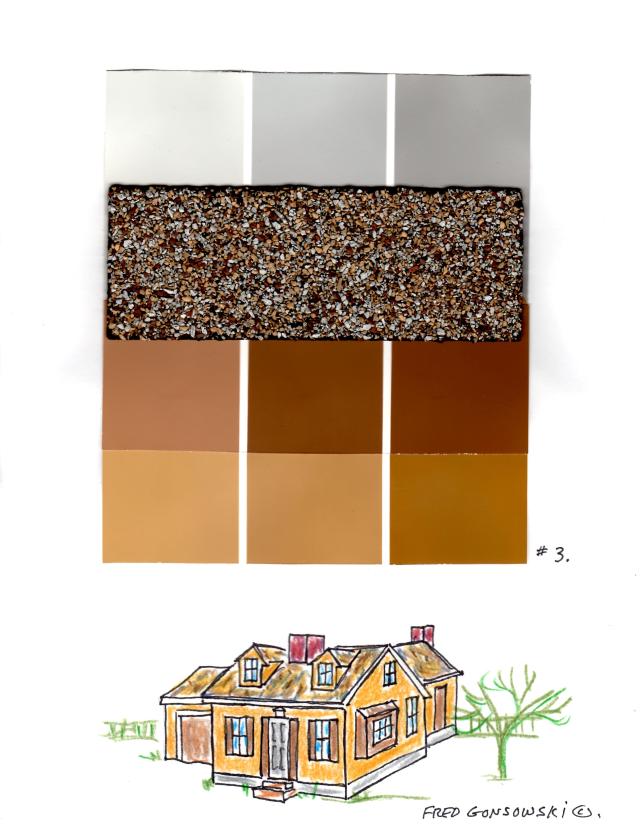 Next look at illustration #3 This roofing shingle is composed of sands in the colors medium-gold, russet-brown, and medium-light gray. Option 1 (shown) is a house with a medium-gold body, light gray door and trim, with russet-brown shutters, and side box window. Option 2 could be medium-gray house, light gray trim and door, light russet-brown for window sashes, and dark russet-brown for shutters. Both of these options are different, and only work because they have the roof to justify these colors being used together. A third more common option, that would go with this roofing shingle is: a medium-light gold house, white trim and door, and russet-brown shutters (forgetting the gray in the shingle altogether).