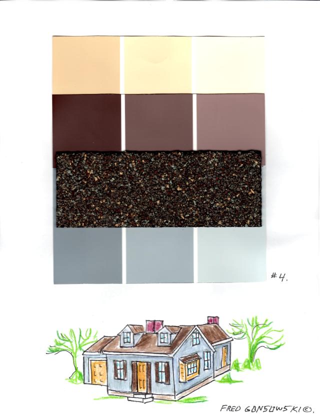 Now look at illustration #4 This roofing shingle is composed of sands in the colors dark chocolate-brown, medium gray, and medium-light gold. Color option 1 (shown) is a medium gray house, light gray trim, doors and side box window in a medium-light gold, and dark chocolate-brown for shutters. Option 2 is a medium gold house, light gold trim , medium-light gray doors, and dark chocolate-brown shutters. Option 3 is a medium-dark chocolate-brown house, with medium gray for windows, light gray for the trim, and medium gold for doors.