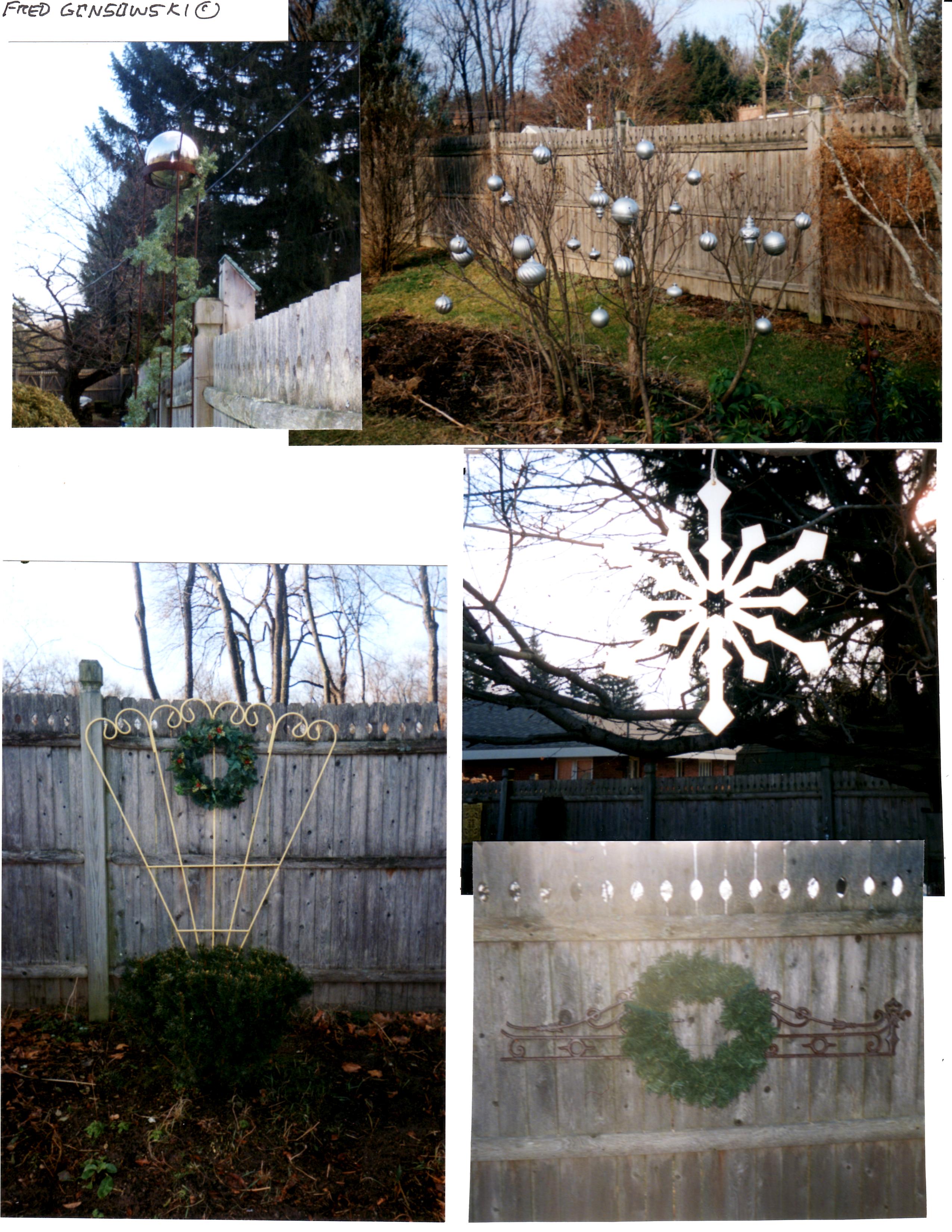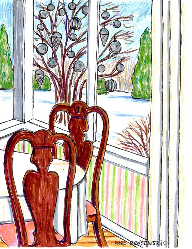 By my dining room windows, I cover one of my three lilac bushes with different sizes and shapes of Silver toned plastic Christmas ornaments. The Silver says Winter, Cold, and Sculptural. You don’t want to use colors that read Christmas like red or green