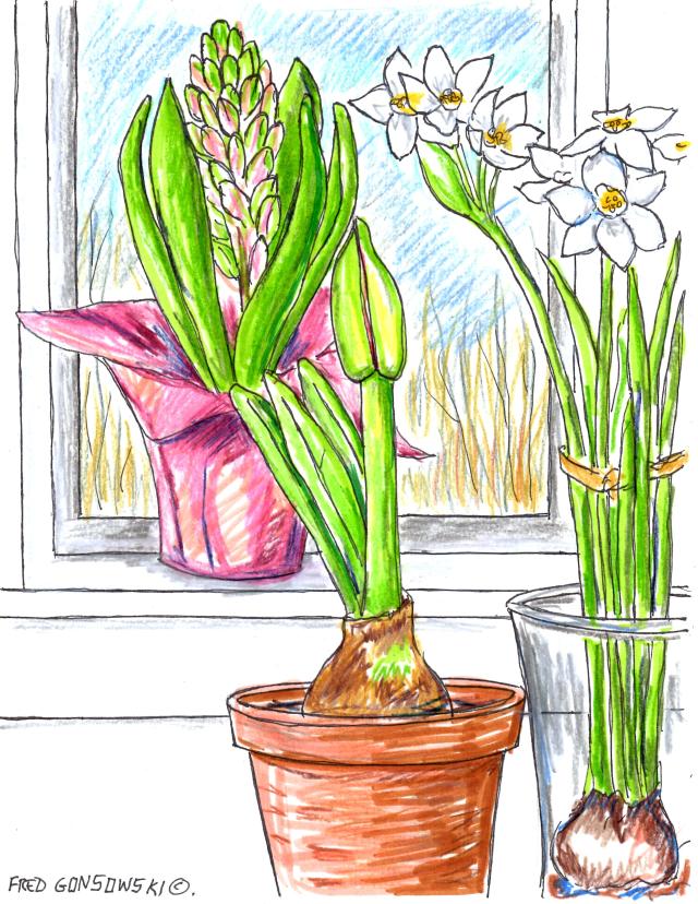 Right after New Years Day, the florist department of my local grocery store puts out 4 and 6 inch pots of pre-chilled Daffodils, Hyacinth, Tulips, and on occasion Crocus, for sale. They start selling them after January 1, and seem to wrap up their offerings after Easter. I like to buy the smaller pots of bulbs, so the pots fit easily on the windowsill, and the smell of the blooming flowers in not that overwhelming. I try to find flowering bulbs that are just starting to emerge from the soil they are potted up in. That way I can watch / study their growth habits, as they go from just nubs, pushing up out of the soil, to their full beauty, when they are in flower.