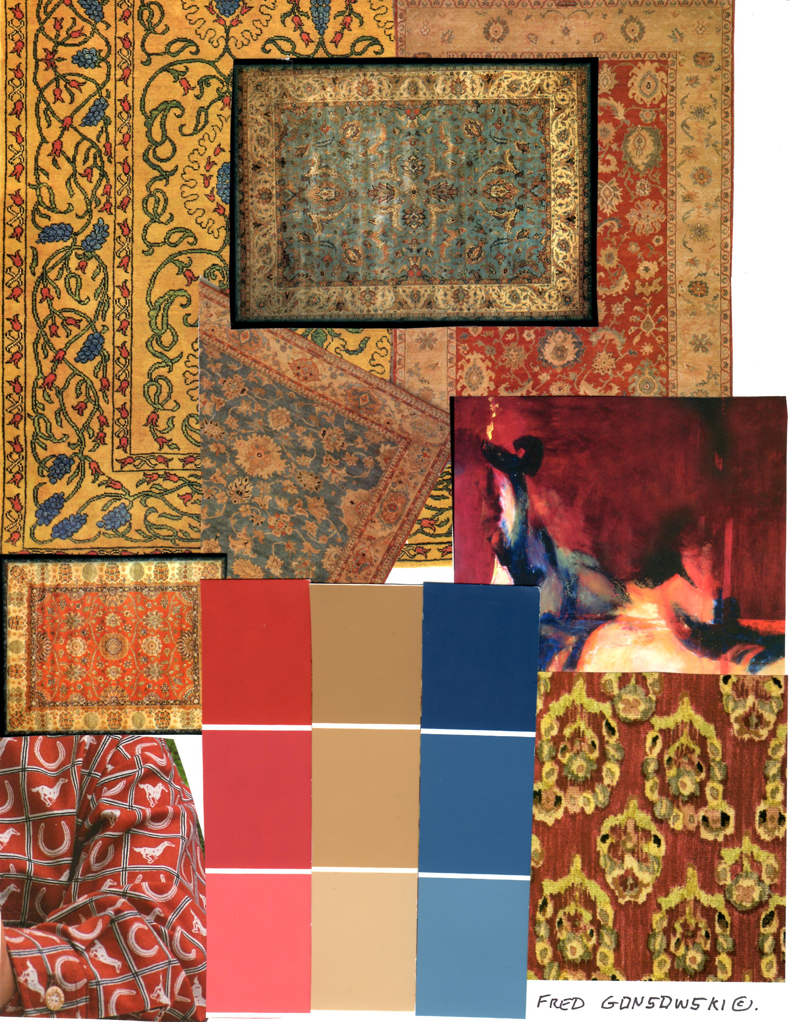 In the collage above, I have put together a number of different patterned oriental rugs, a picture of a painting, and a couple of different samples of fabrics, that would possibly be seen in an entry way. All the elements that make up this collage share the same colors. A russet red, tones of gold, and medium to dark colonial blue. If I were adding a wallpaper sample to the collage, it would be a stripe in one or more of the same colors.