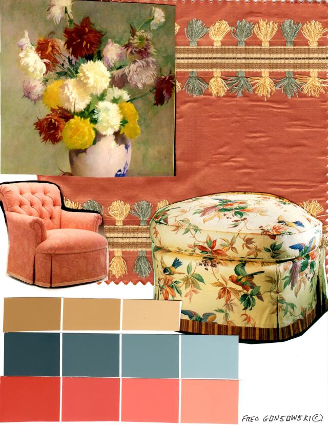 In the collage above, I have assembled a picture of a painting, a fabric swatch, and pictures of some furniture. The three paint samples, show the colors that are pulled from those decorative elements.