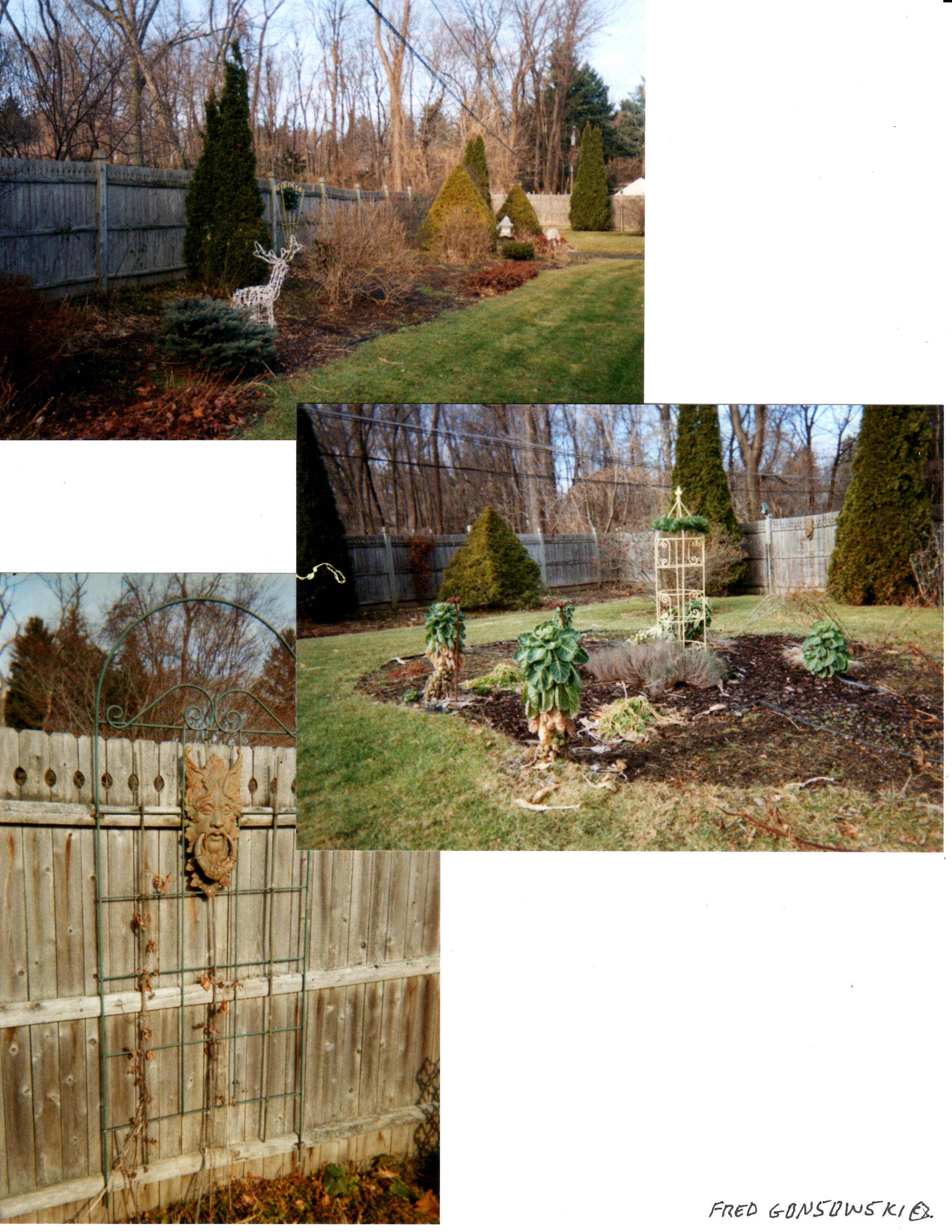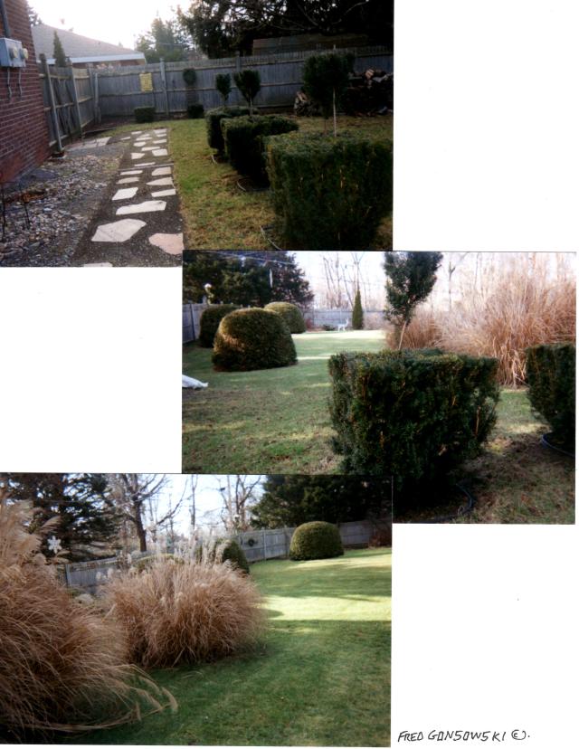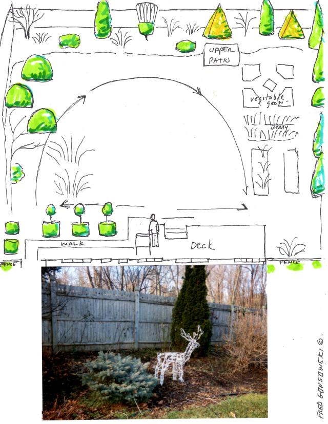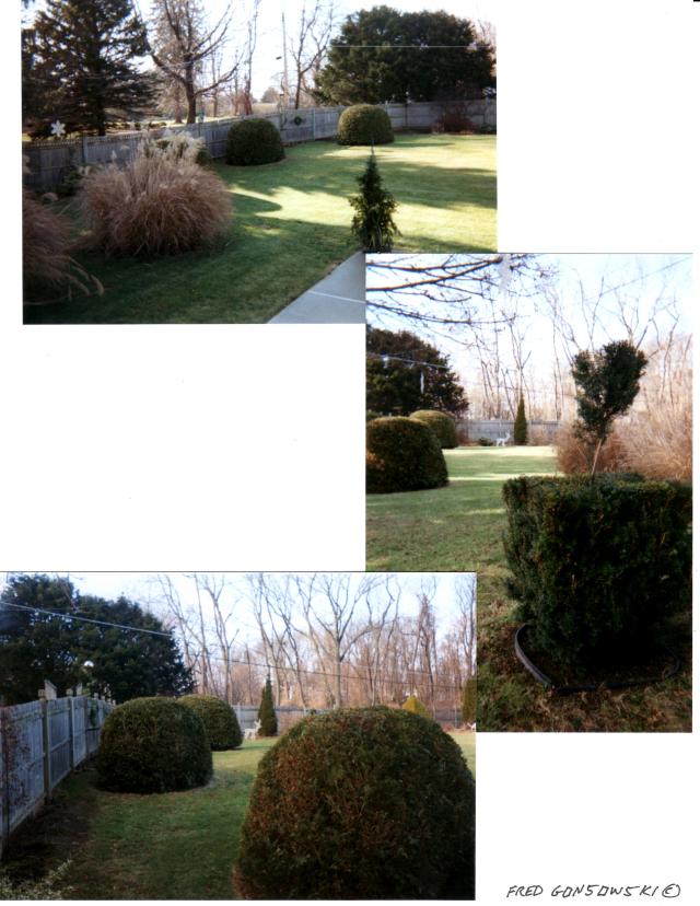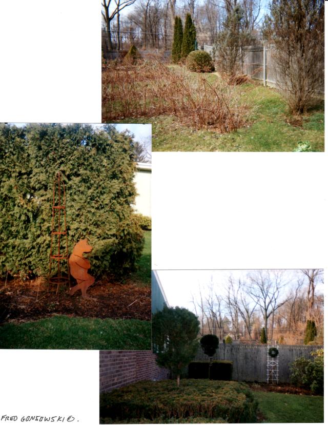 My goal, when placing evergreens in the garden is / was to site them so there is always something to look at in Winter, in front of the gray-beige bark of trees that are without their leaves. I want them placed so my eyes move from one green thing to another, as I look across my 125 x 125 foot back yard. The lawn and garden views are important to me, if I am outside on the deck, or looking from one of the windows that are on the back of the house.