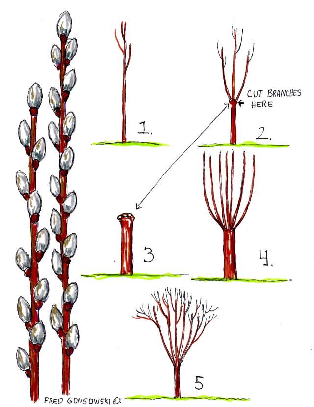 The yearly chore of cutting off all the branches in late Winter or early Spring must be done so the pussywillow does not ever grow side branches. If the side branches form the tree will start to change shape, and only pussywillow catkins will grow at the ends of the branches. A pussywillow that is allowed to grow naturally can get 20 to 30 feet tall (illustration 5).