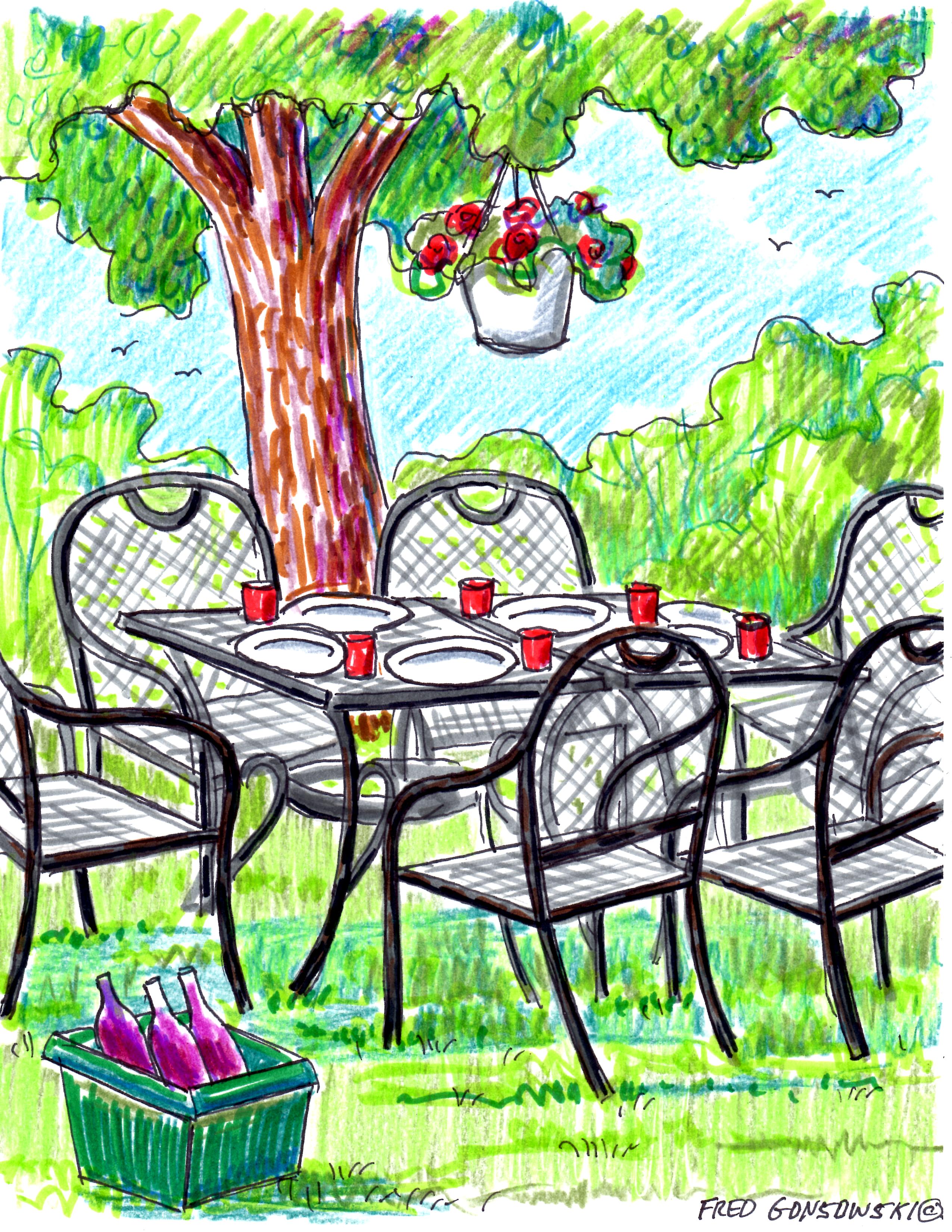 The reasons I like having two small tables versus one large picnic table are threefold. 1..I can easily pick up the tables by myself and move them when it’s time to cut the grass. The tables are light, but heavy enough so they are not moved/toppled by strong winds. 2..Having a pierced grate kind of top allows light to filter downward to the ground, so the grass stays green under the tables. 3..At the end of the outdoor dining season, the tables can easily be used in the cellar, or stacked one on top of the other, as are the outdoor chairs.