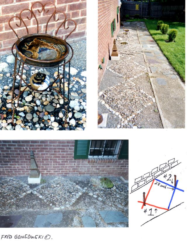 After forming the first half of the diamond, I then started on the second part. I laid two bamboo sticks on the ground, one at the edge of the sidewalk where I just finished making one part of the diamond, and one by the house where I had just finished making the other end, and brought them together to form the second half of the diamond. I then measured out 28 inches from the house to where the two sticks came together to make sure they came together at exactly 28 inches.(Look at #2 on the illustration in blue). After that I started again planting stones from the center of the diamond, the 28 inch point, working toward the house, and then toward the sidewalk until I completed the first full diamond pattern. I then worked on the second diamond and all the other consecutive diamonds, repeating the two steps until I had finished making them all. Because the width of the space varied, as I made each consecutive diamond, I continuously measured out 28 inches from the house for each diamond’s points so the center points of all the diamonds would line up with each other as they progressed along the sidewalk.