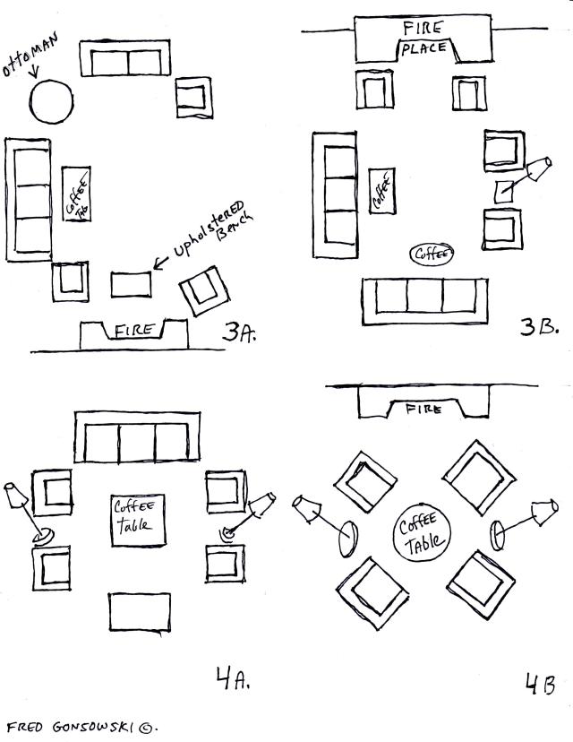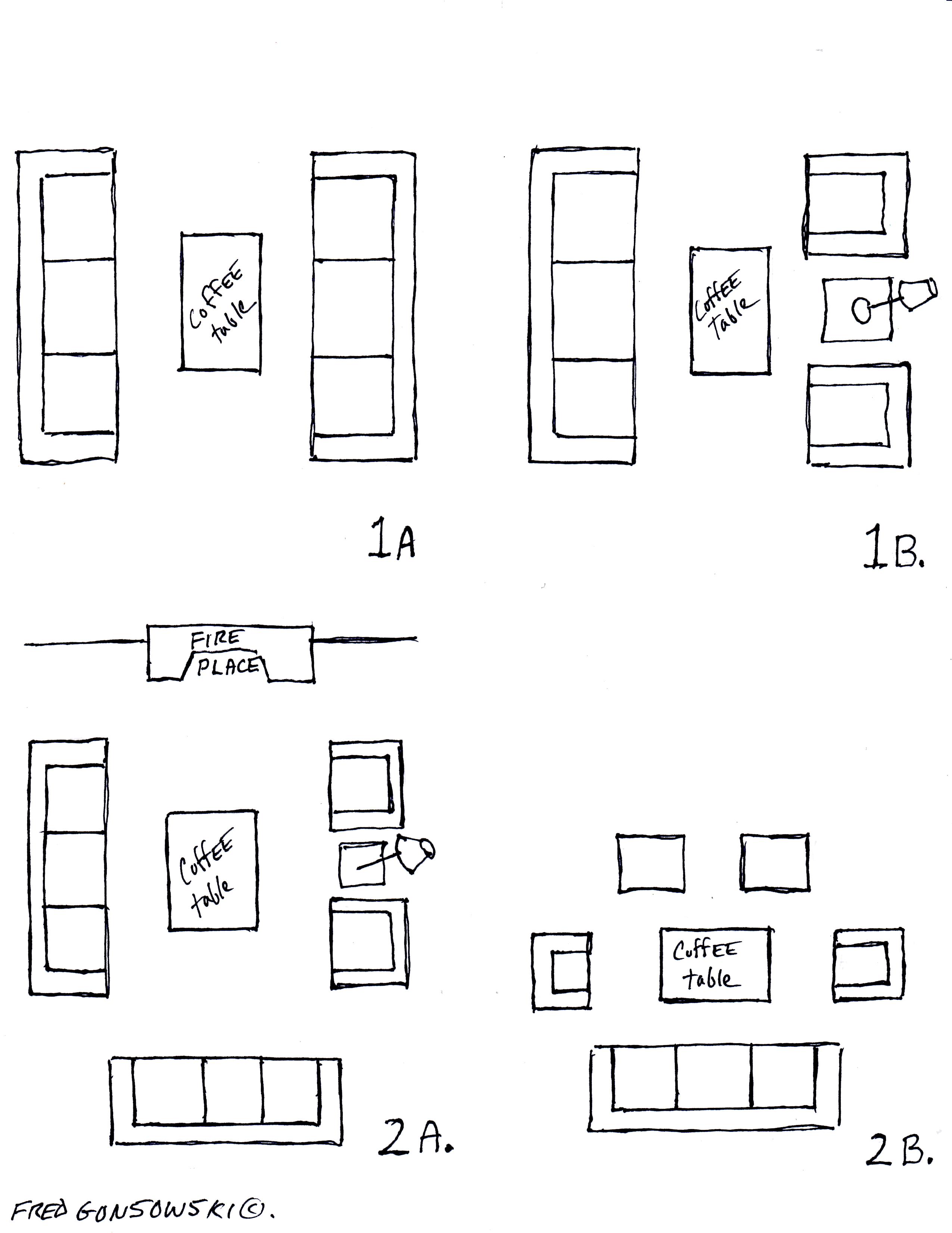 Illustration 2B is a compressed version of 2A. In 2B you have the 3 cushion sofa that anchors the grouping (it is the largest piece). The sofa is flanked on both its left and right by upholstered or occasional chairs. Two other chairs, or even upholstered benches or stools are across from it.