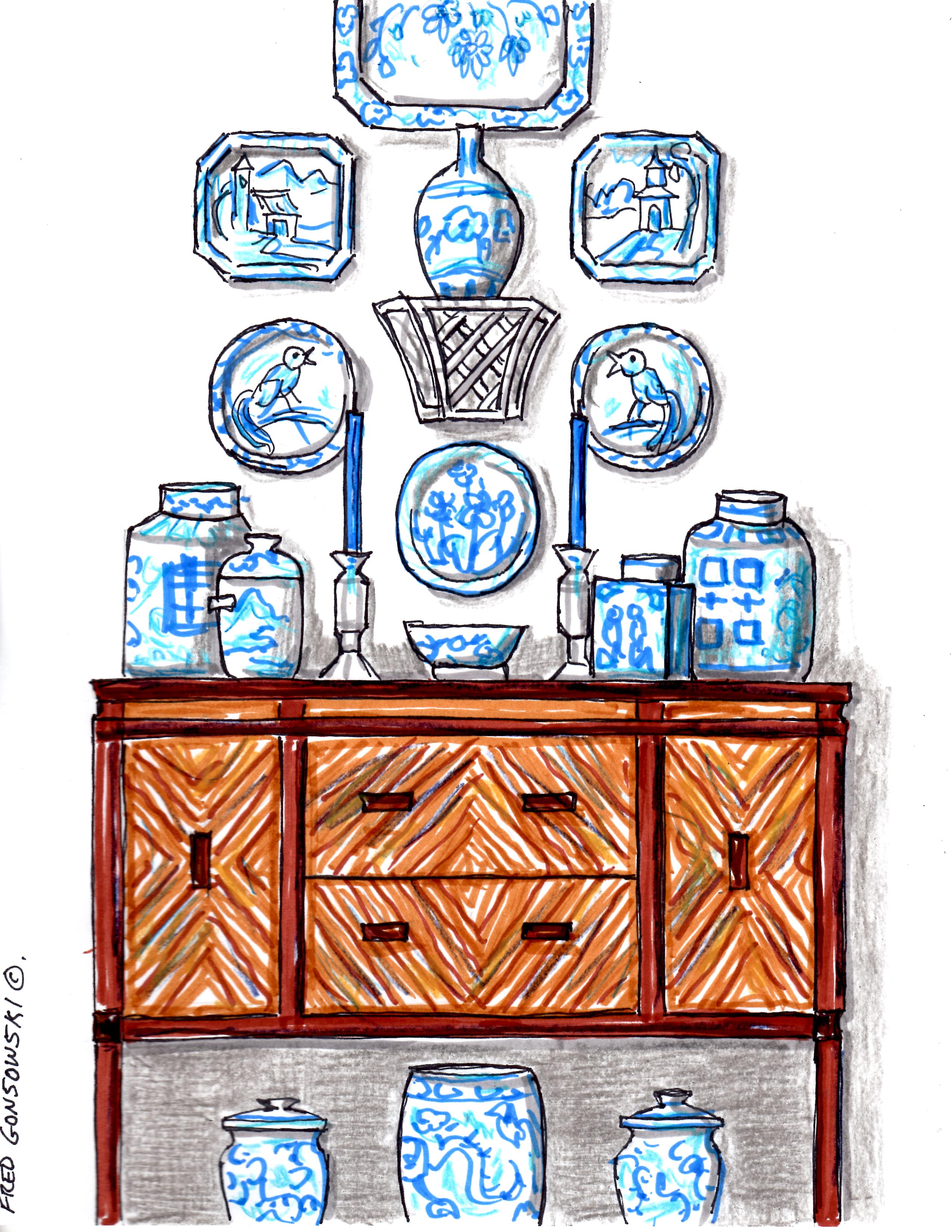 • Verna, the illustration for the cover of this post is of my Grandmother’s buffet that is in my dining room. The arrangement of Blue and White is a lot like what I have here, BUT my dining room is an old Sherwin Williams color called Lounge Green, and there is wallpaper and chair rail molding. The collection of Blue and White in the dining room is a mix of antique and new pieces. It is not about the age, but how they look in the space.