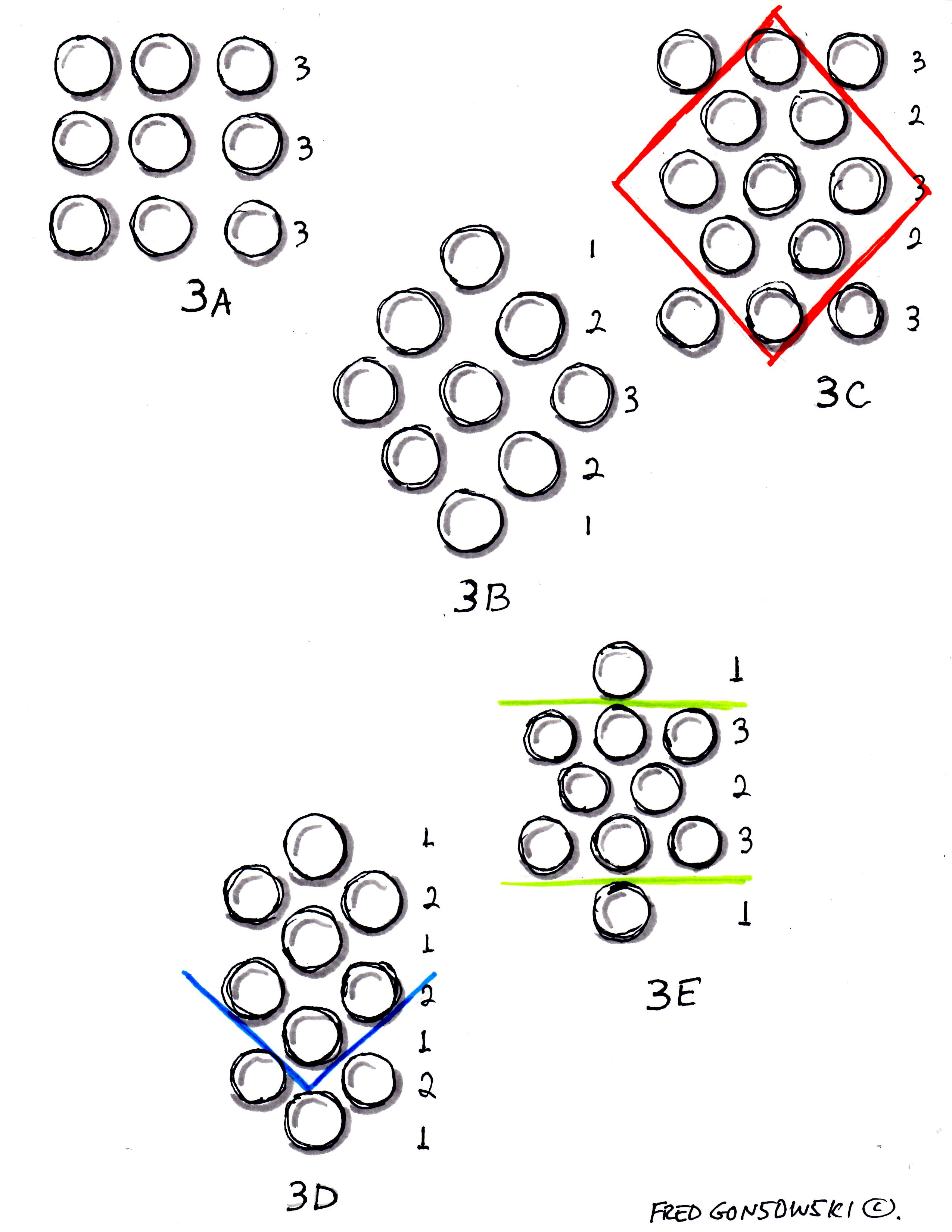 Illustration 3B is a diamond pattern. It is the square 3A turned on its side. The numbers to the right of that illustration (and all the other illustrations in this section) show the amount of dishes per row that make up that grouping.