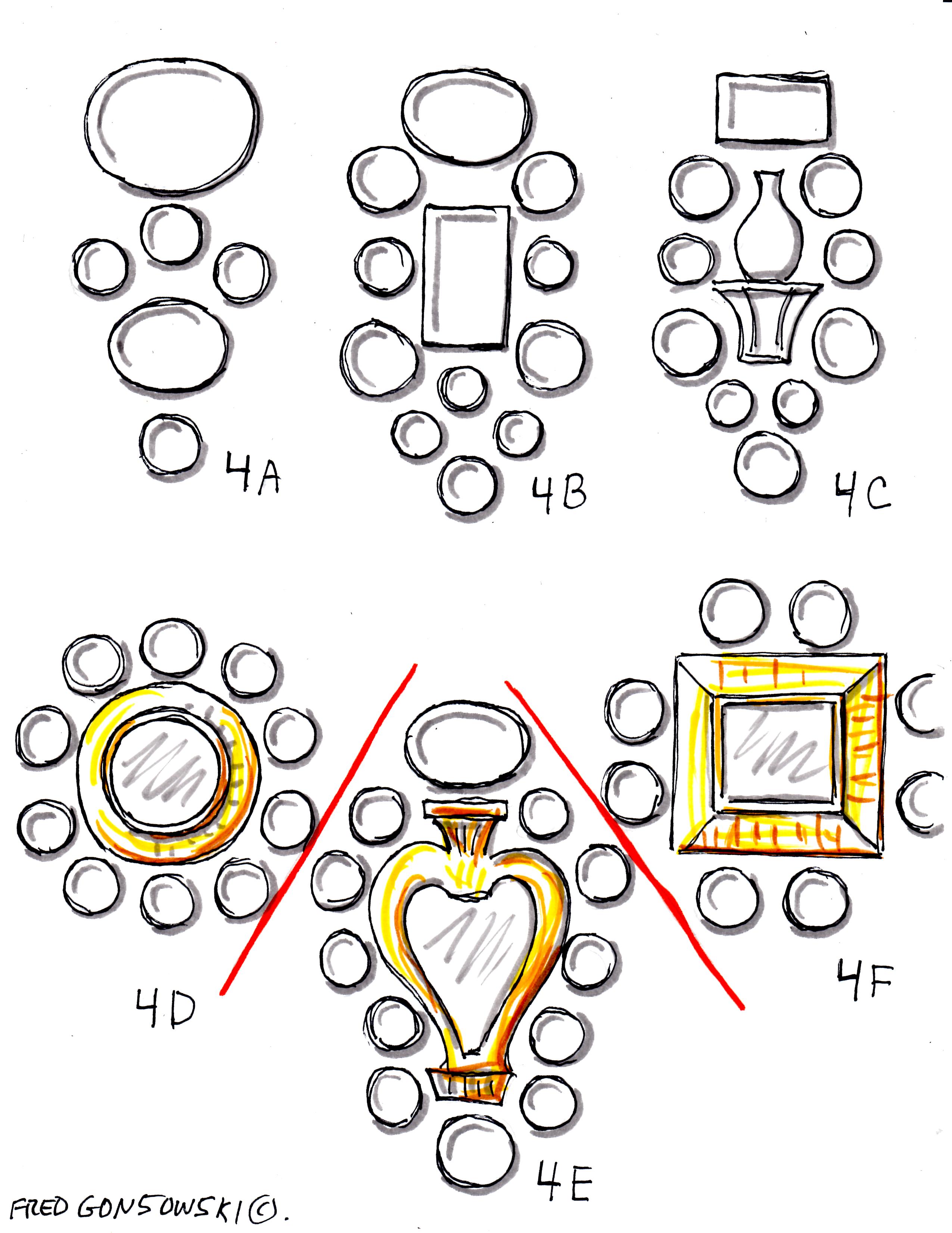 Illustrations 4D through 4E show how a mirror can be the centerpiece of an arrangement. A painting, wall clock, decorative light / candle sconce, or a sculptural relief wall plaque are other possible choices. When picking things to hang around the just mentioned, choose things that are not as visually bold as the centerpiece, and try to find things that go with and pick up the colors of the main element. It is not just about the individual pieces, but how everything looks together in the end.