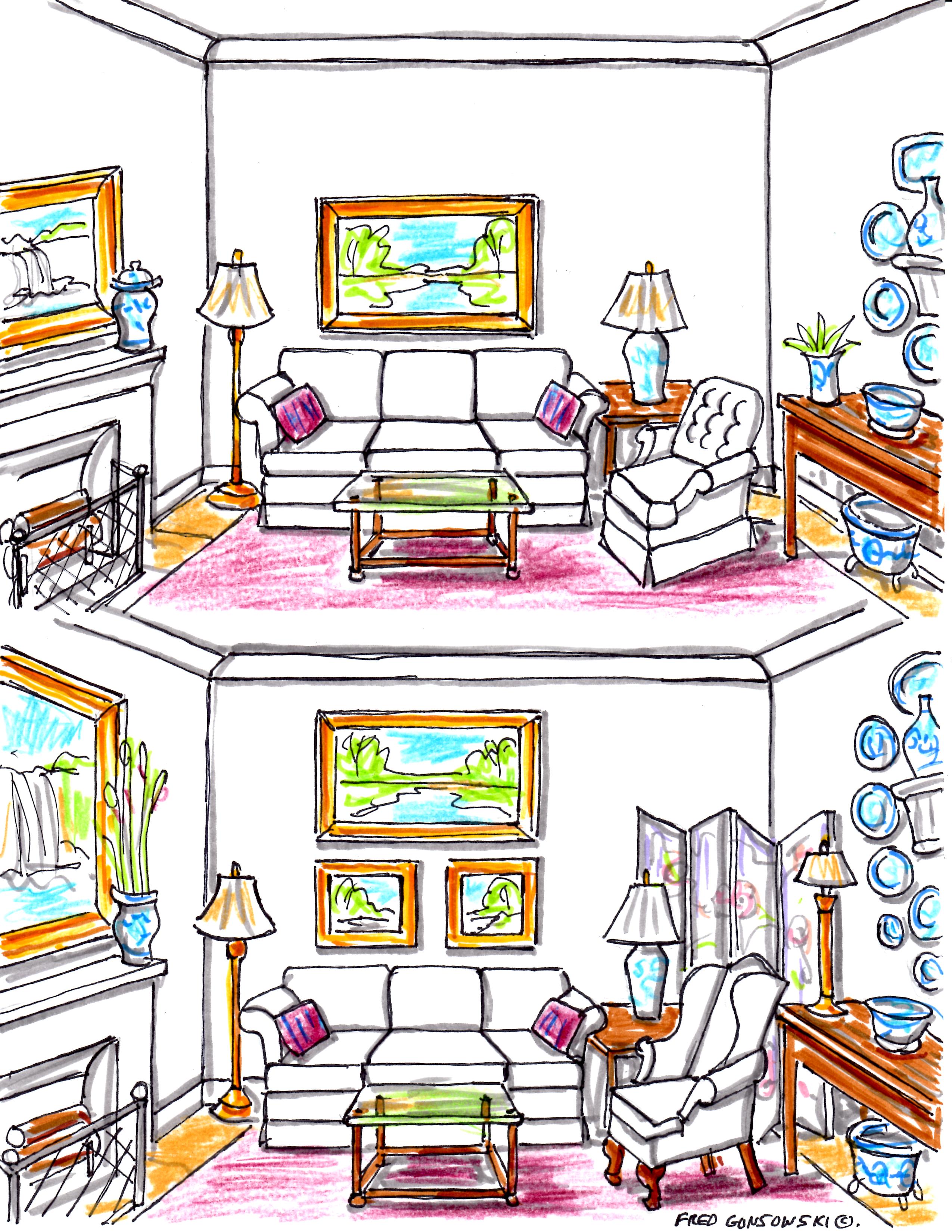 The final thing that I want you to notice about the comparison of rooms on the cover illustration is that the top illustration has a lot of horizontal format items in it (the sofa, low chair, picture over sofa, table against wall, coffee table, and picture over the fireplace). In the bottom illustration, other than the re-stacking of the artworks, the introduction of the wing chair, Chinese folding screen and candlestick / buffet lamp on the credenza are all vertical format items and help fill in space and direct you eyes upward.