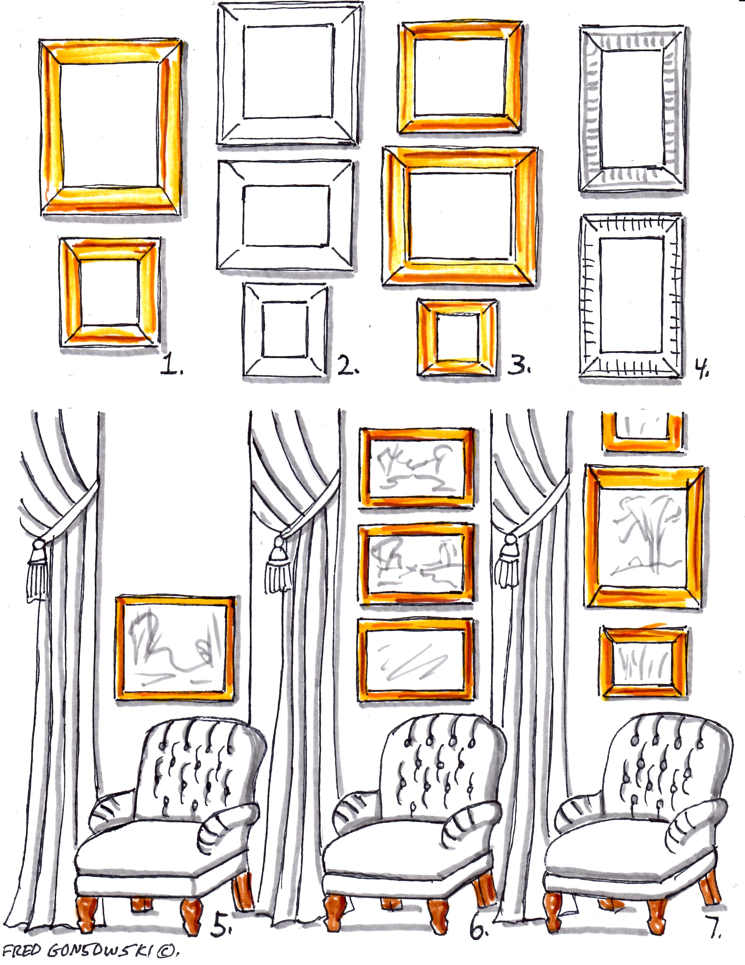 The different patterns of hanging artworks, illustrations 1-4, are to get thinking about how to hang framed pieces in corners of rooms.