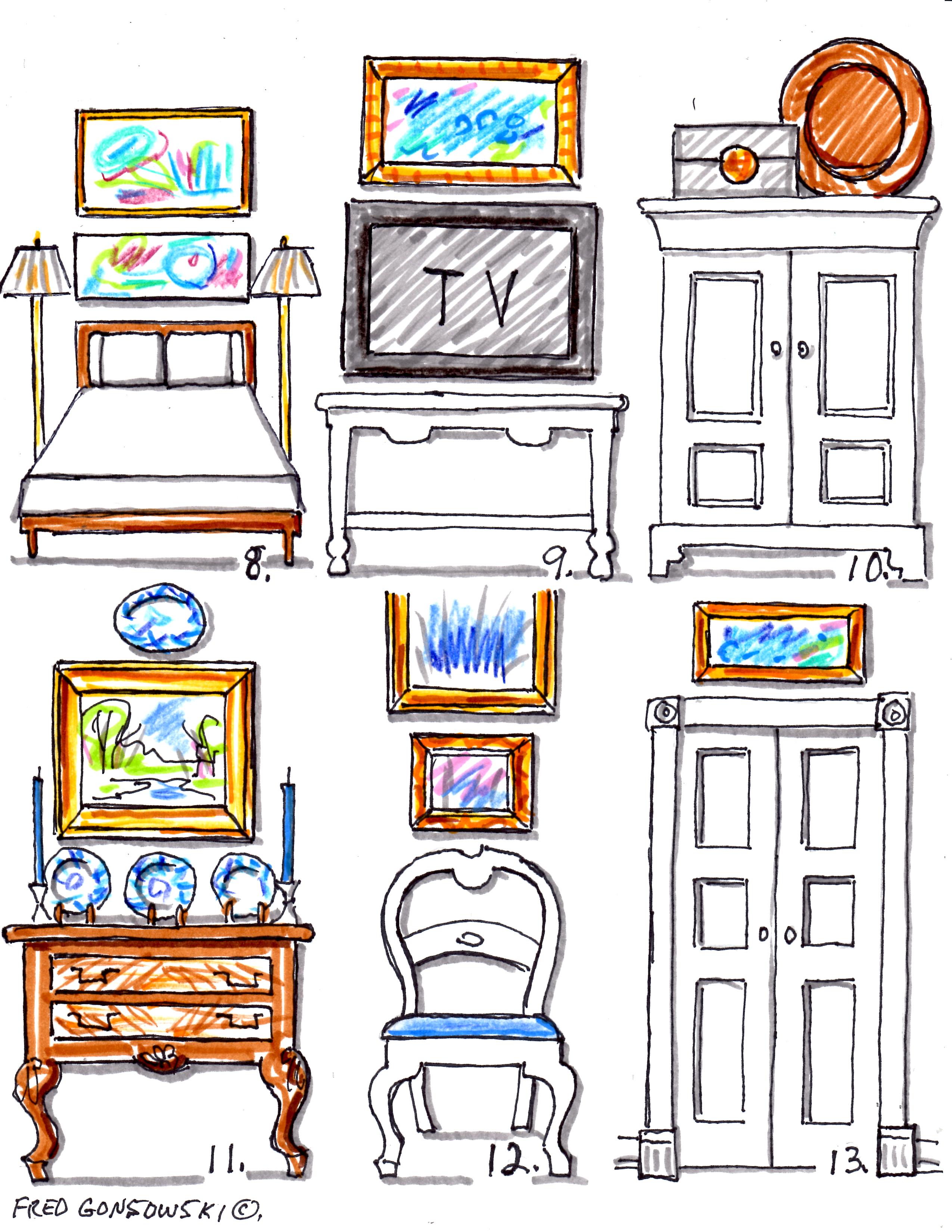 Illustration 9 shows how a horizontal format TV can be hung over a horizontal format credenza, and an art object or mirror can be hung above everything to make one vertical tension grouping.