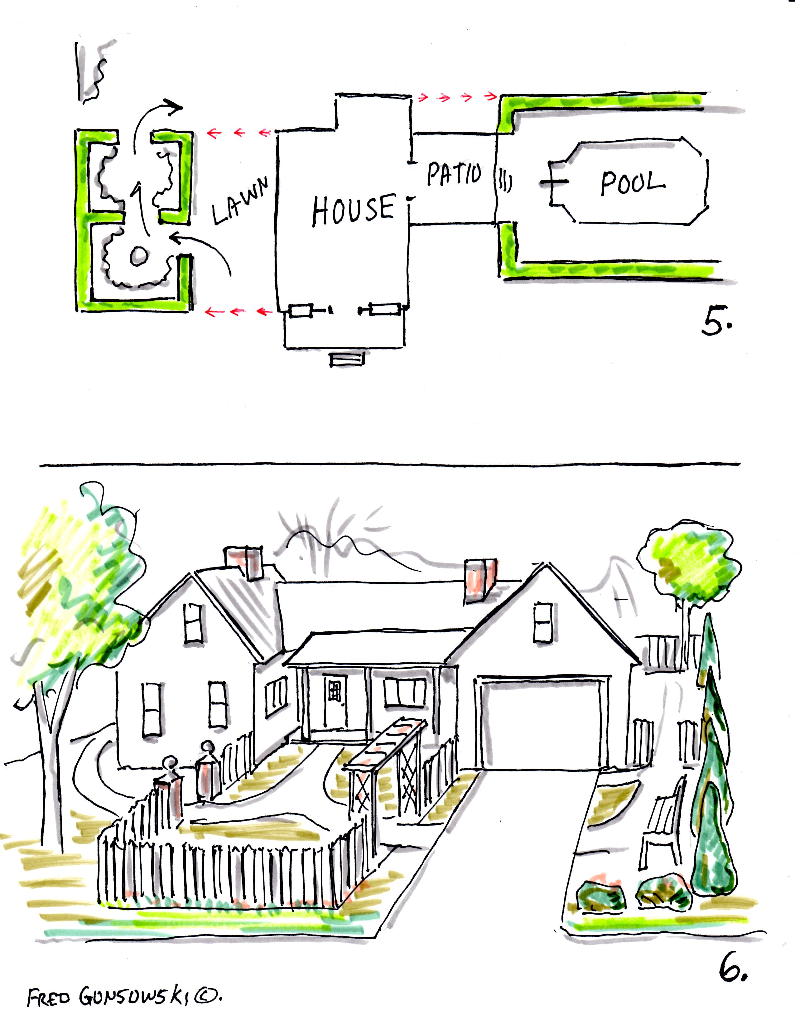 Illustration 5 shows an example of a two spaced garden room with multiple entries, that is on the left side of the house. Notice how the garden room is the same size as the house. Also notice, how a second garden room is to the right of the house around the pool. The red arrows show how natural lines come off of the house and line up with the garden rooms.