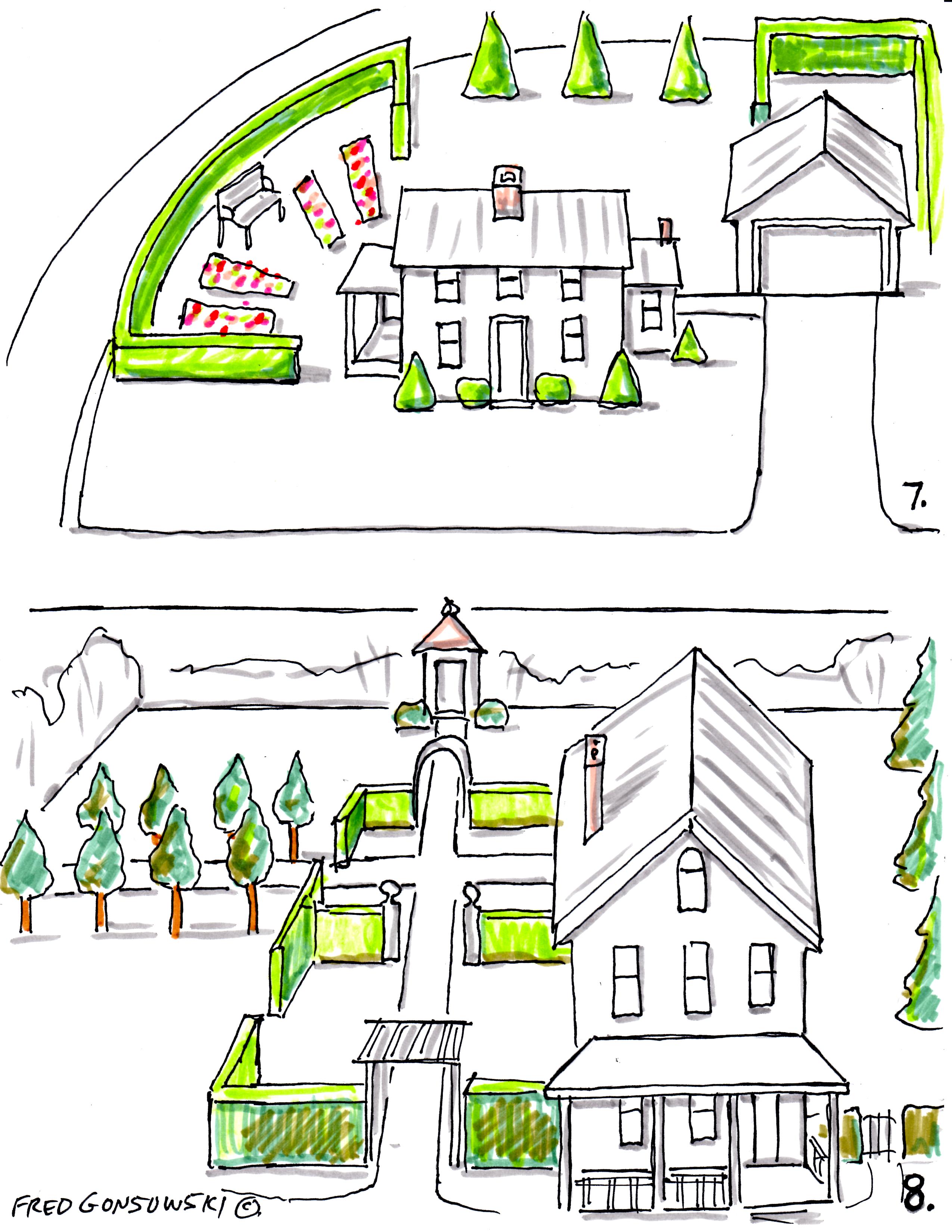Illustration 7 shows a house that has a road going across its front, and another that comes alongside and travels behind the property. A garden room was created by the planting of a hedge (it could also be a wooden fence) that lines up, at the front left of the property with the front facing side of the side porch. The planting or fence follows along the road on the left, to the back of the property, where it turns back toward the house lining up with the natural lines made by the left back corner (wall) of the house. In this drawing four straight line flower beds radiate out from the house, directing your eye back to a garden focal point; in this case an inviting bench. Directly behind the house three cone-shaped spaced evergreens suggest enclosure to the space right behind the house. In this part of the yard, think Great Lawn. More evergreen hedges or decorative fencing runs behind the garage suggesting enclosure and creating more outdoor wall space.
