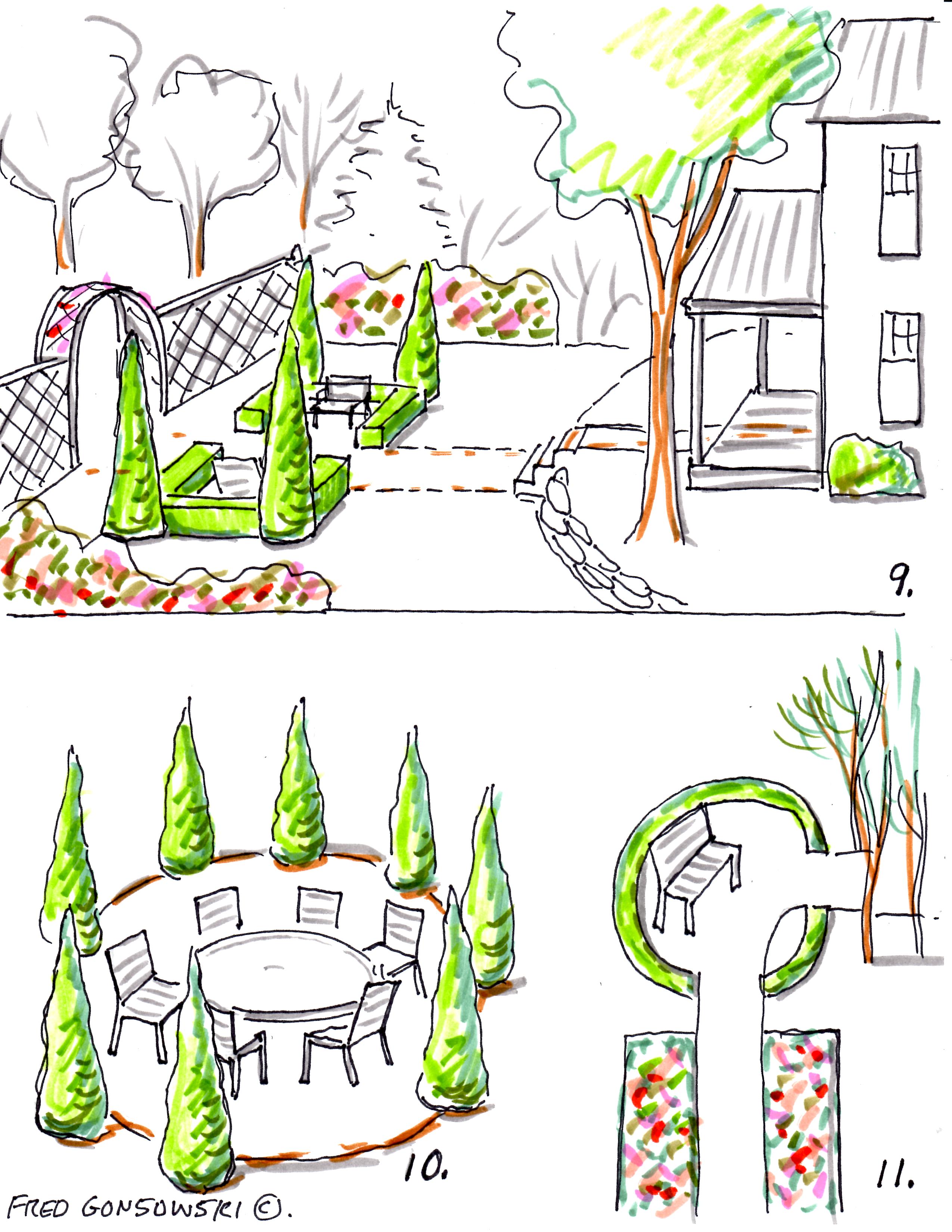 Garden Follies-Whimsical garden rooms .. Illustration 10 shows a garden room (folly) that is not completely enclosed, but has a feeling of being enclosed. Tall upright narrow column shaped trees run around the outside edge of a circular outdoor dining area. The idea of being surrounded by a repetitive planting of the same plant material suggests a room space, and at the same time is quite sculptural looking.