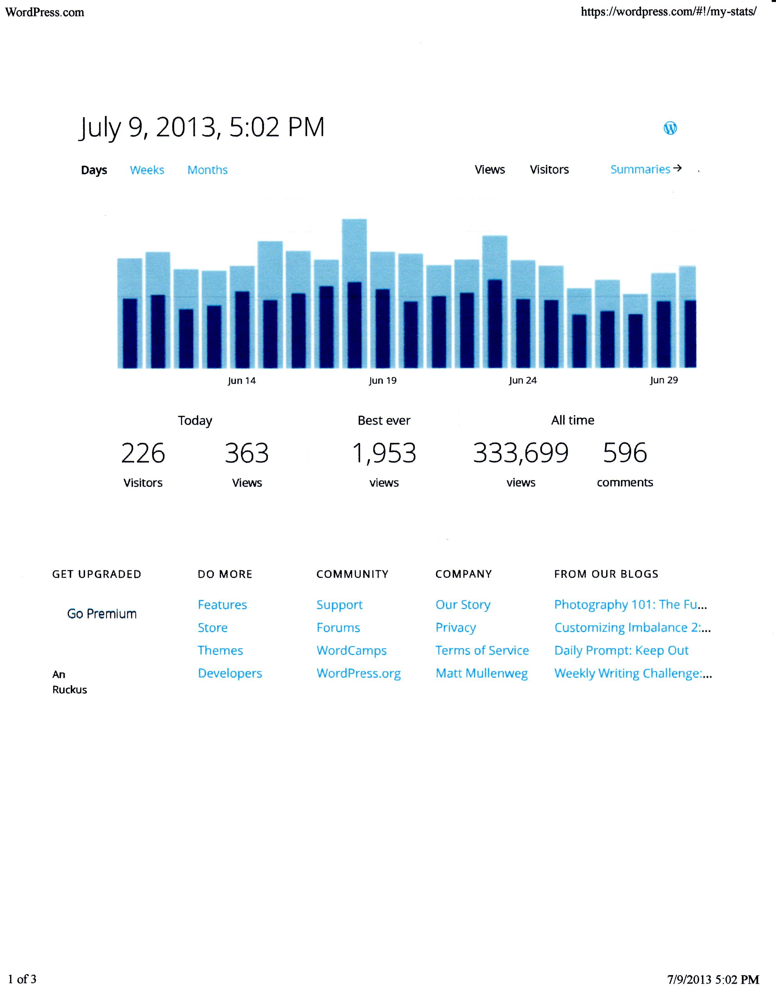 Now let’s look at the first graph for this blog post that shows today’s stats, which are daily provided by WordPress. As of 5:02PM, today, July 9, 2013, I’ve had 333,699 page views / articles read since starting the blog. Today, so far, 226 visitors to my site have read 363 articles. The dark blue on the bars represents the visitors, the light blue is articles read. WordPress says on average I have 1.45 to 1.85 articles read by each visitor.