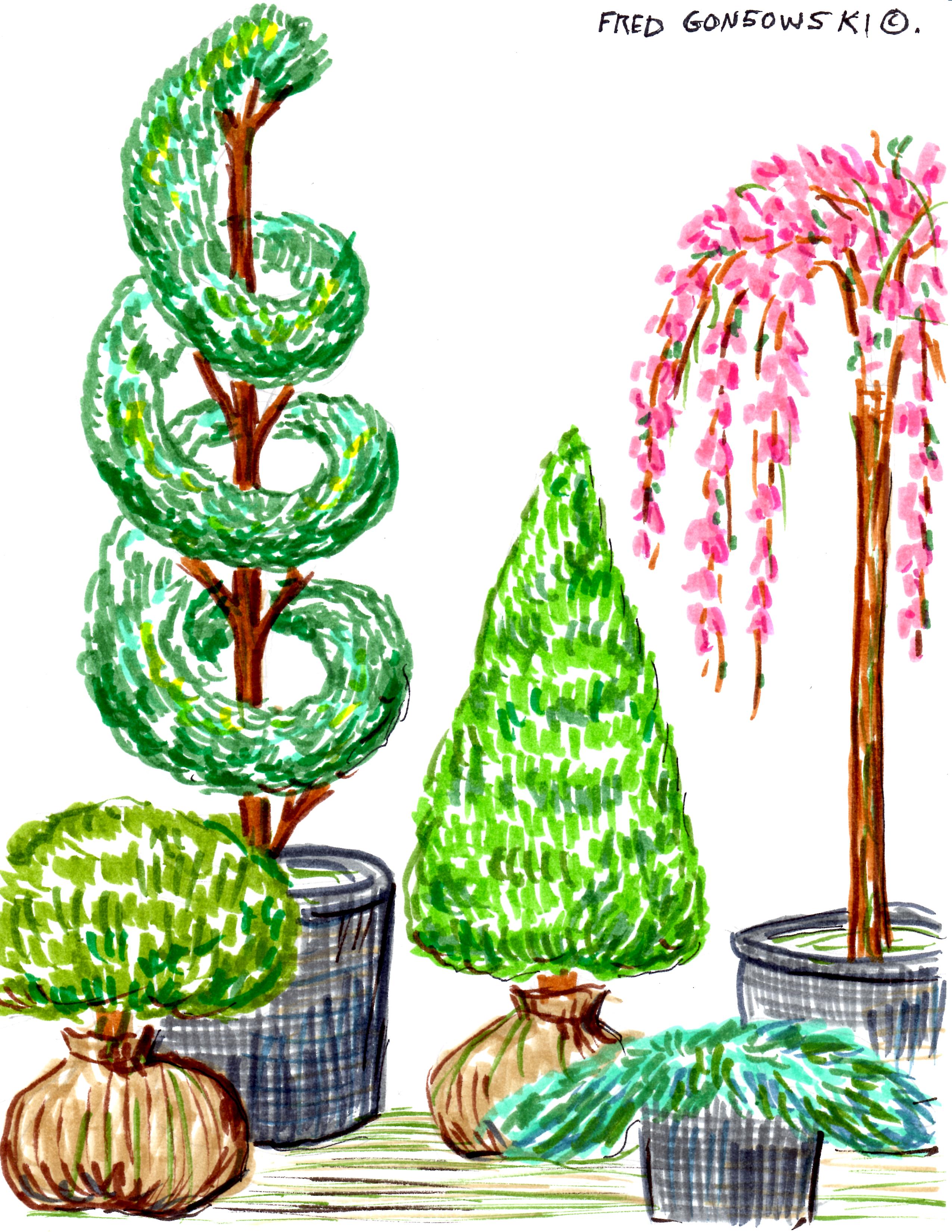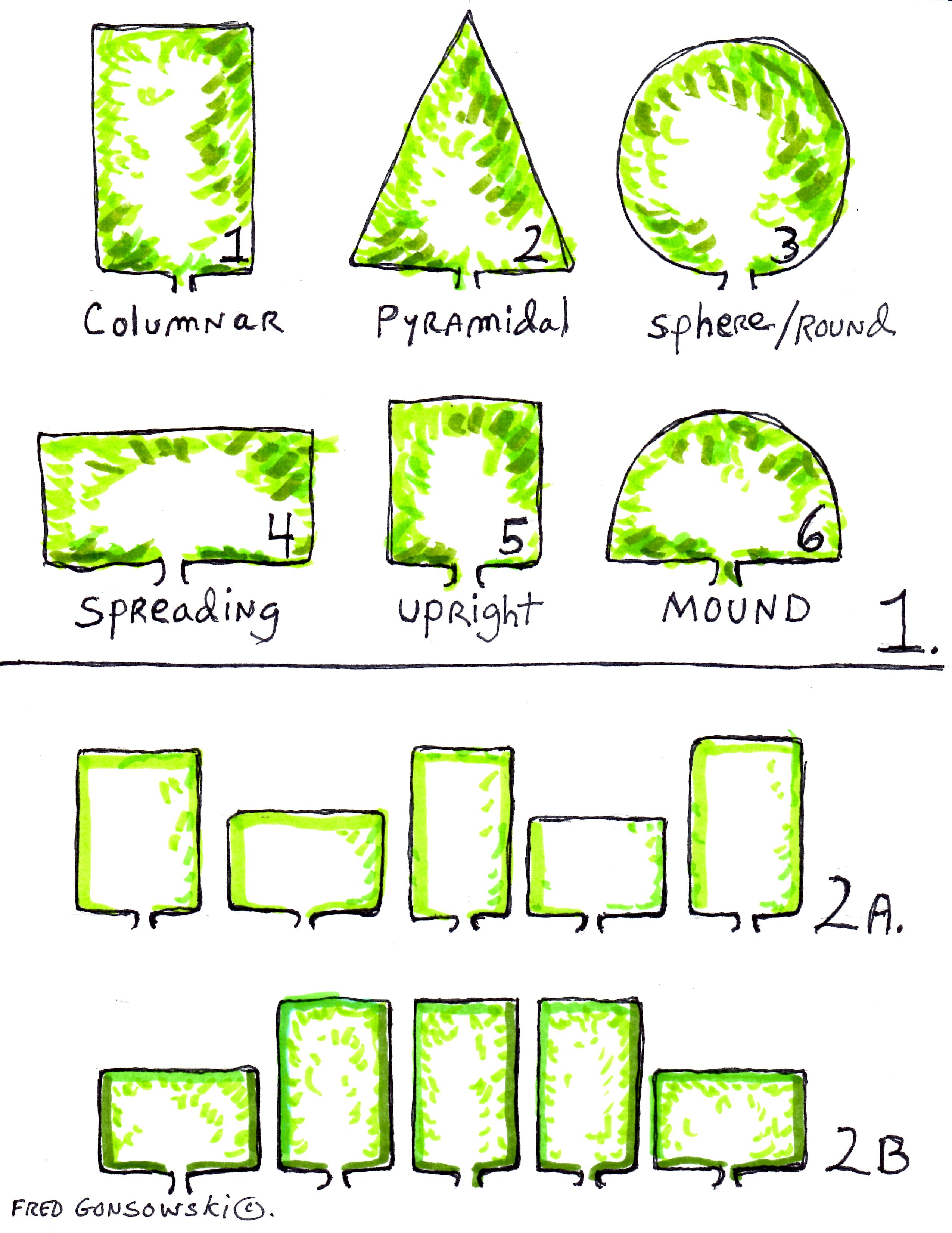 There are many shapes of bushes and trees, but in the world of foundation plants I feel there are only six classical shapes that are most often used. img310 (now look at illustration 1). They are #1 columnar, #2 pyramidal, #3 sphere / round, #4 spreading, #5 upright (which is a shorter version of columnar), and #6 mound. The six shapes can be seen on bushes and trees that when mature can be one foot tall to over 10 feet high, depending on the variety, their natural growth habits, and if you shear them or not.