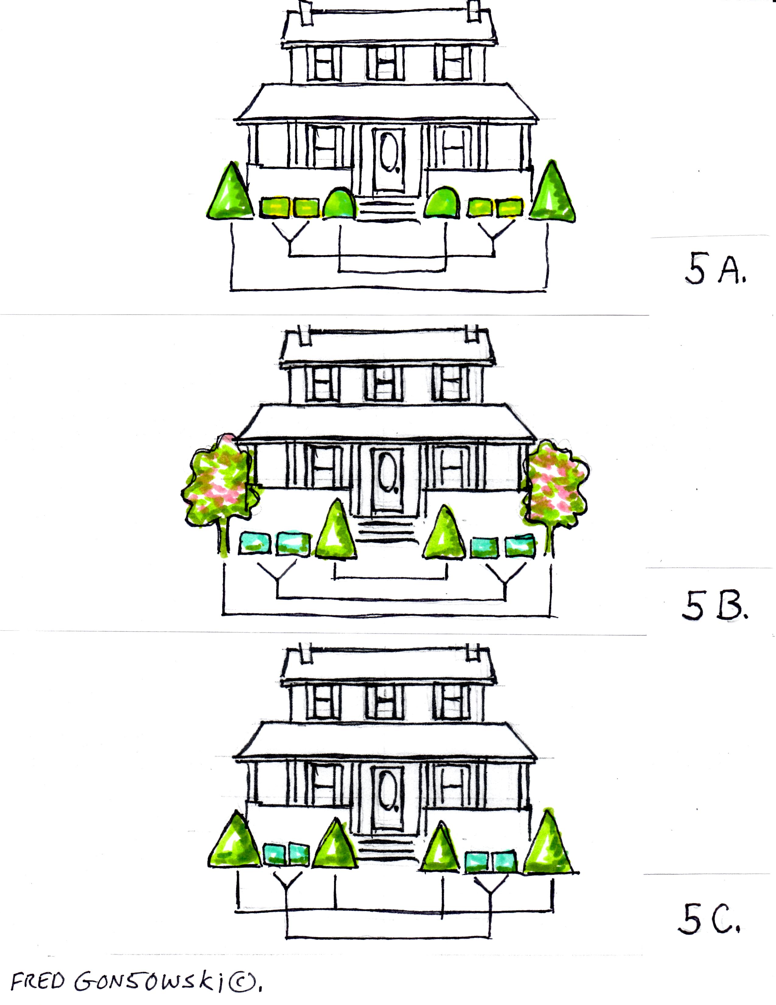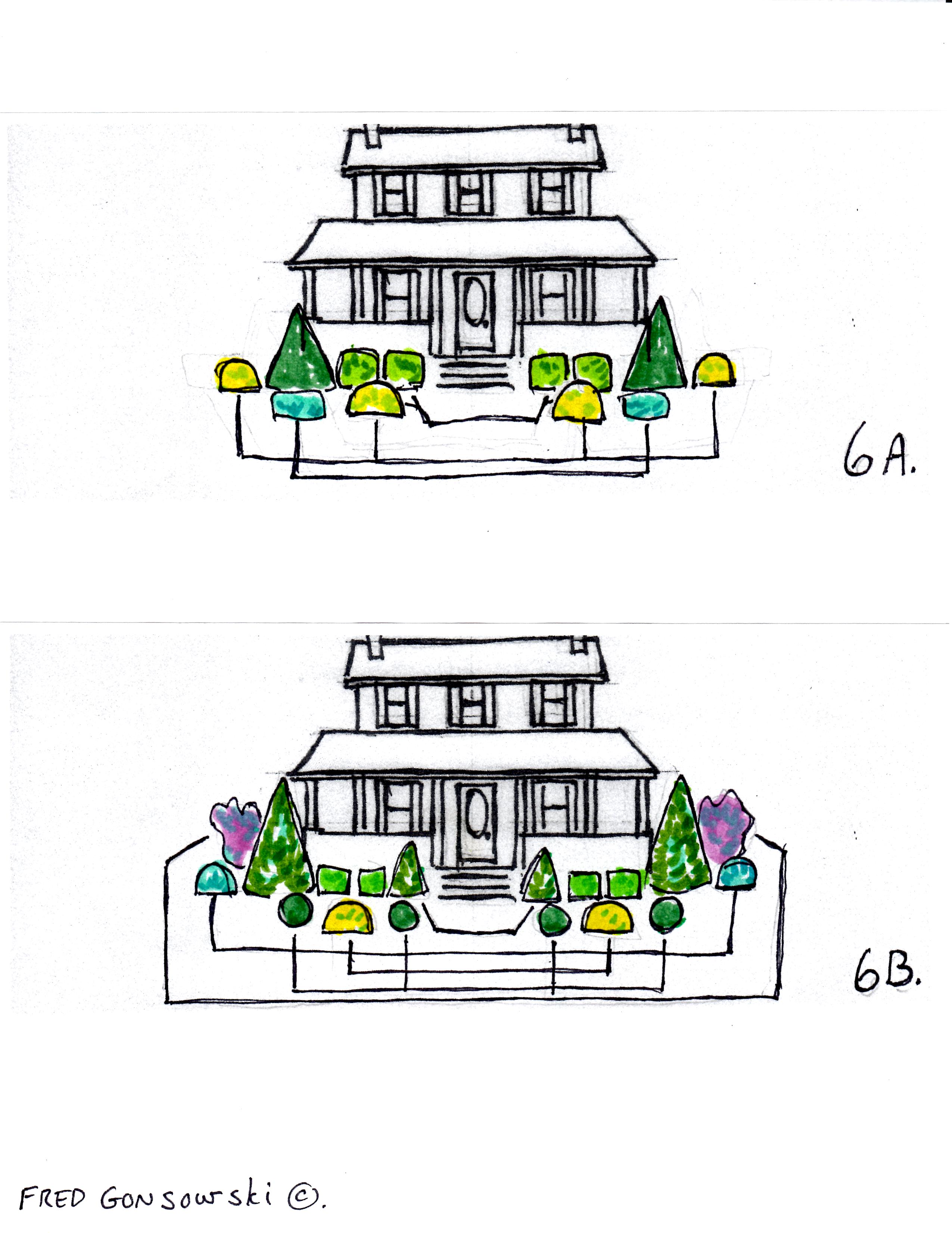 Now in Illustration 5B we take the same house and shows how two dwarf trees (that when mature will only grow up to the eves of the porch) are positioned at the ends of the porch. Their taller growth habit makes the high ends of the smile. Two pyramidal yews were placed on either side of the porch, but because the yews are not that tall and you have the height of the trees that frame the ends of the house, the yews don’t seem to cut the movement that runs across the front of the house. Your eyes seem to sweep across the front of the house easily without being stopped by the yew.