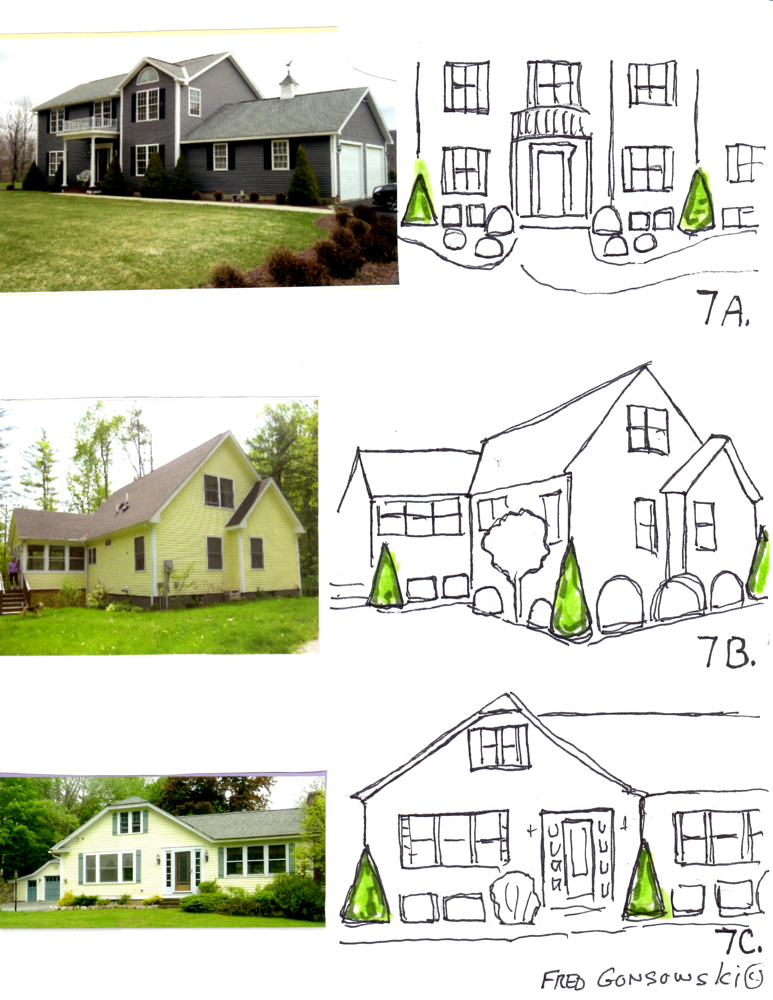 Illustration 7A shows a house with gabled roof lines coming off the house in different directions and at different heights. With a house like that try to look to see if you can find some symmetry in it. Looking at the photo of the house, notice how to the left of the front door are two windows. Next look at how two windows are also to the right of the front door. In illustration 7A, I took the spaces that are both to the left and right of the two sets of  windows (as seen in the illustration) and started planting my smile there with taller / higher type plantings. By punctuating the facade of the house there with the taller plantings, the porch, entryway and two sets of windows are framed, but the house is not chopped up into pieces.