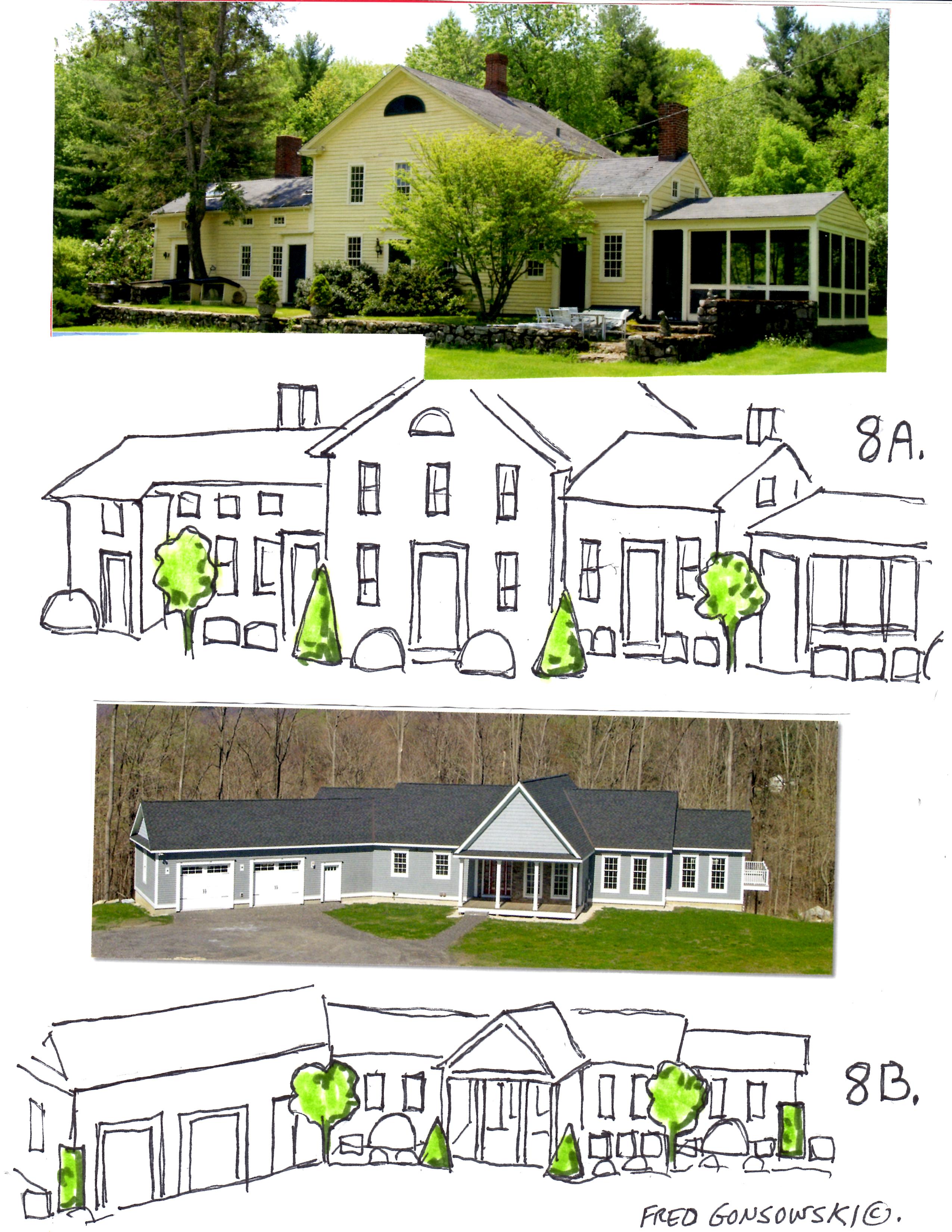 Illustration 8A shows a house with many different roof lines coming off of a house with a two and a half story center. The natural place to punctuate the facade with taller shaped plants is at the ends of each place where the roof lines change, as I have shown in the illustration. Also notice how in my illustration how mound and spreading or upright shaped plants are also repetitively placed across the front of this house.