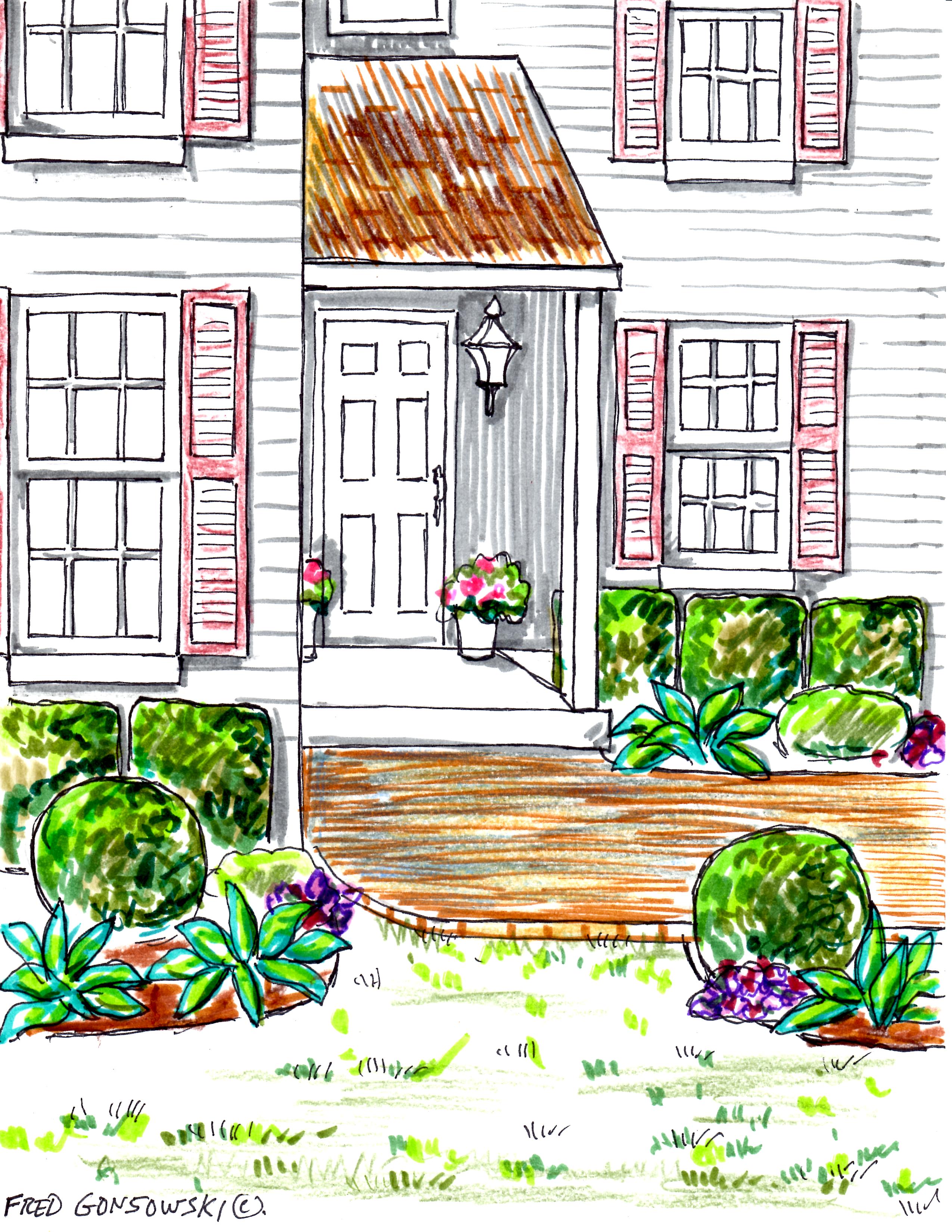 When laying out foundation plants, on the street or road side of your front sidewalk, think about leaving a space in the planting bed and do it in grass instead. By doing it that way, you have two different walkways out front; one from the front door to the driveway and garage on the paved surface, the other walkway is on the grass which leads and opens up onto your front lawn. Think about your front lawn as a green space, or even an outdoor room on your property.