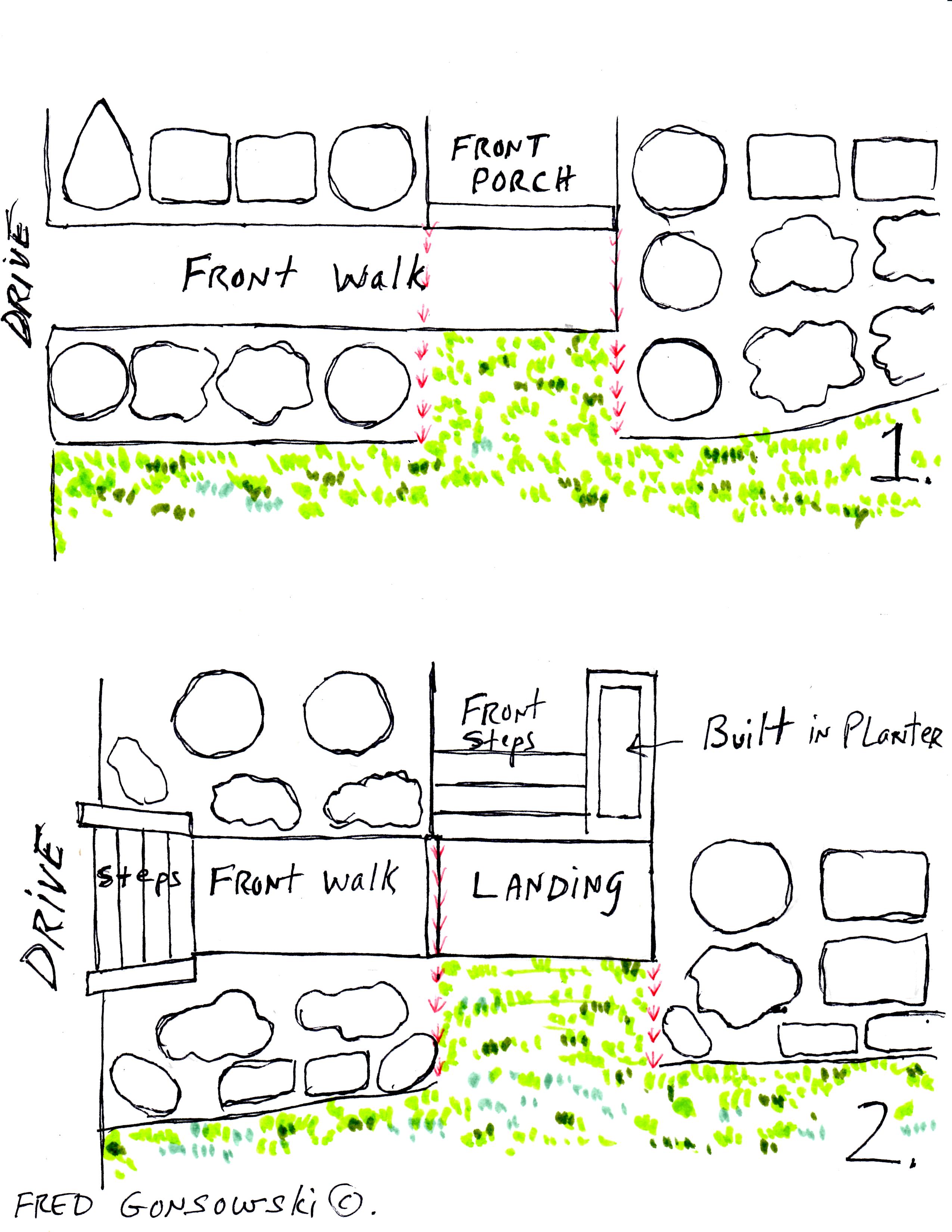 Now look at illustration 1; it shows how the grassy entry was created by lining up the edges of the planting border with the front steps.