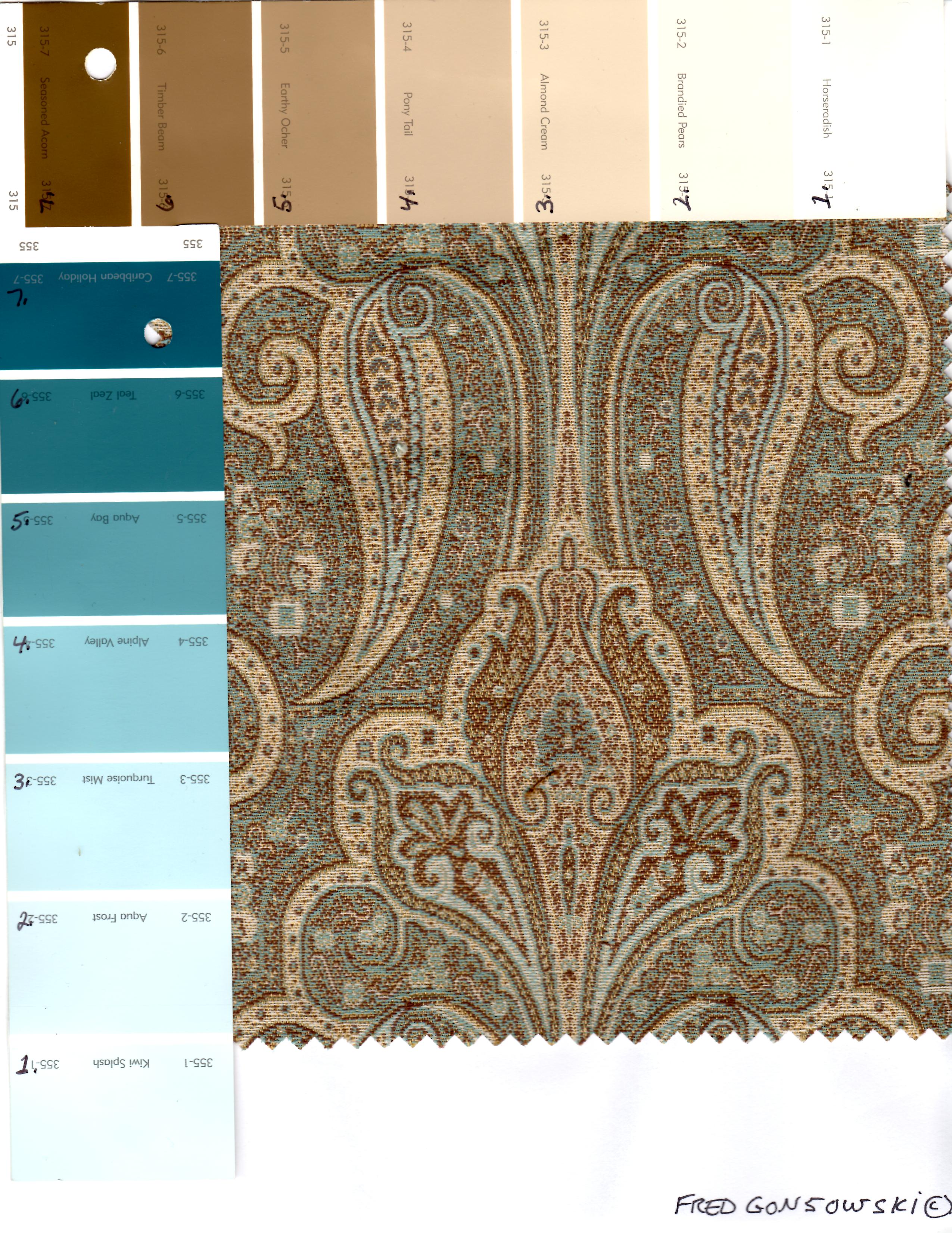 The first is a fabric that has paislies as part of its design. The two predominate colors on the fabric are a golden tan and an aqua-teal blue. When picking the color for the three companion walls for the room, pick one of the lighter tones on either of the strips. For the accent wall go one, two, or even three tones darker. Let’s say you pick the color numbered 2 on either of the strips. An easy choice for the accent wall would be the color number 4, on either of those strips. If you are really brave and bold colors number 5 on either of the strips would be quite dramatic. The main thing is that you want to see a marked difference between the accent wall and the companion walls in the room.