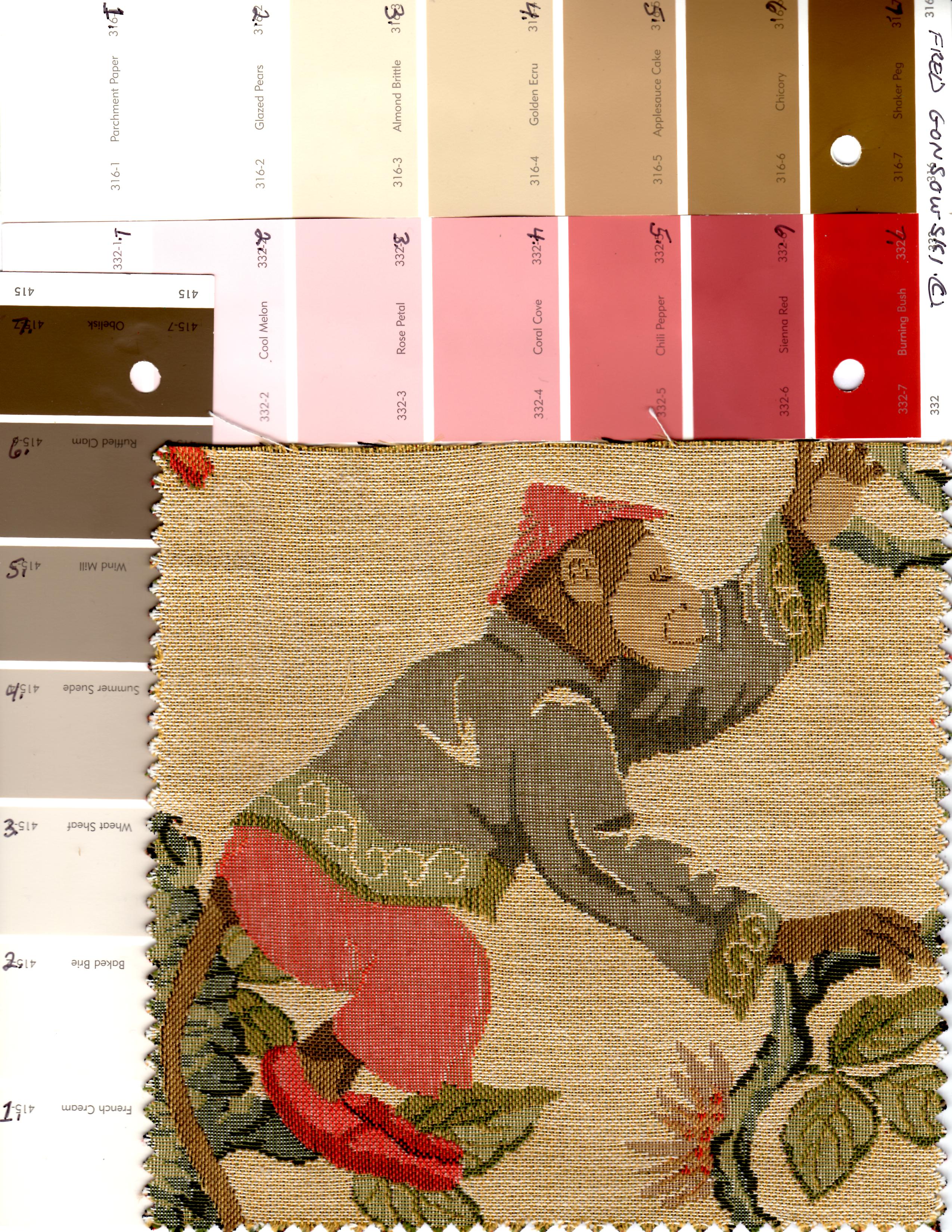 The second sample shows the whimsical monkey. The three strips of paint color samples show colors that appear in that fabric. Again, any of the lighter tones of brown or golden brown on two of the strips could be used for the companion walls in the room if the fabric sample were a wallpaper, and any of the darker colors on any of the strips could be the accent wall if you had this fabric to pull your colors from for both the accent and companion walls in the room.