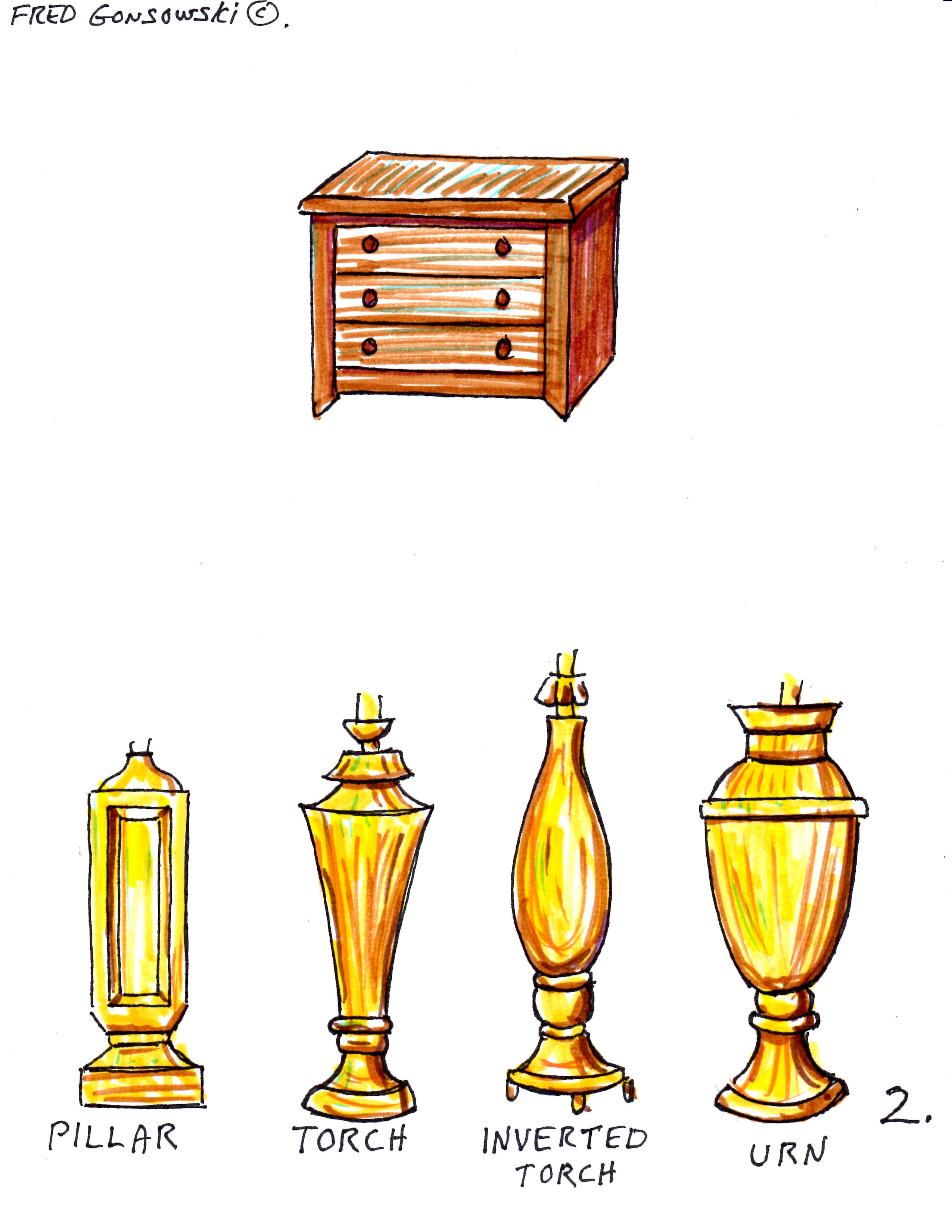 Illustration 2 shows a number of chest styled end tables; which have short or no legs. Look at how solid and heavy-looking they are because you can’t see through or under them. The best types of table lamps to pair with this style of table is also visually heavy-looking. You could possibly use a lamp with a pillar styled base if it is kind of thick looking, but the torch styled, inverted torch and urn styled bases would be your best bet. Examples of these styles of lamp bases are at the end of the illustration. img338img339