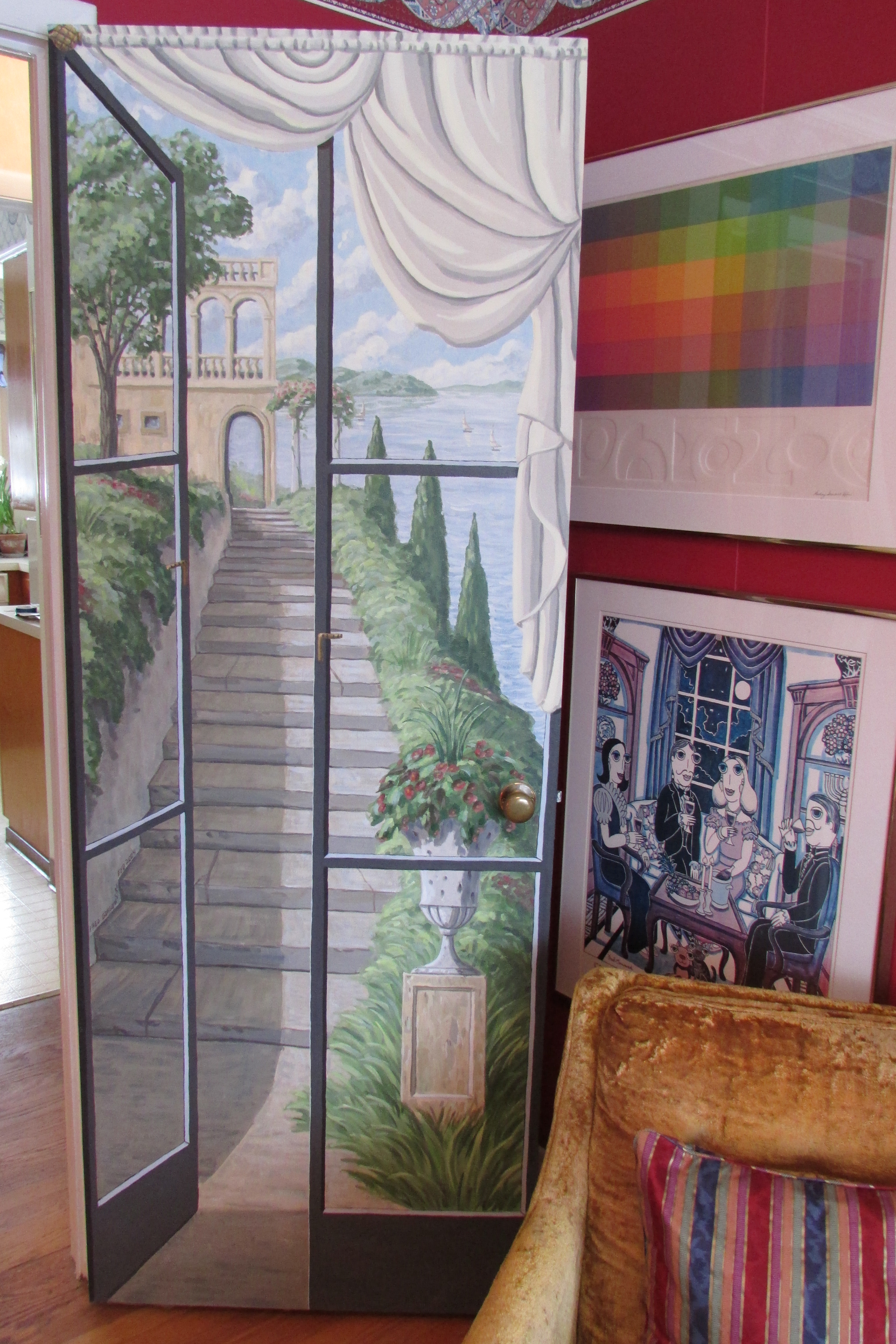 In my red TV room I painted  doors, draped in fabric, that open out onto steps that bring the viewers eyes up to a building that sits on the edge of a cliff by a lake. When I look at it I think I am looking at a Mediterranean villa, possibly in Italy.