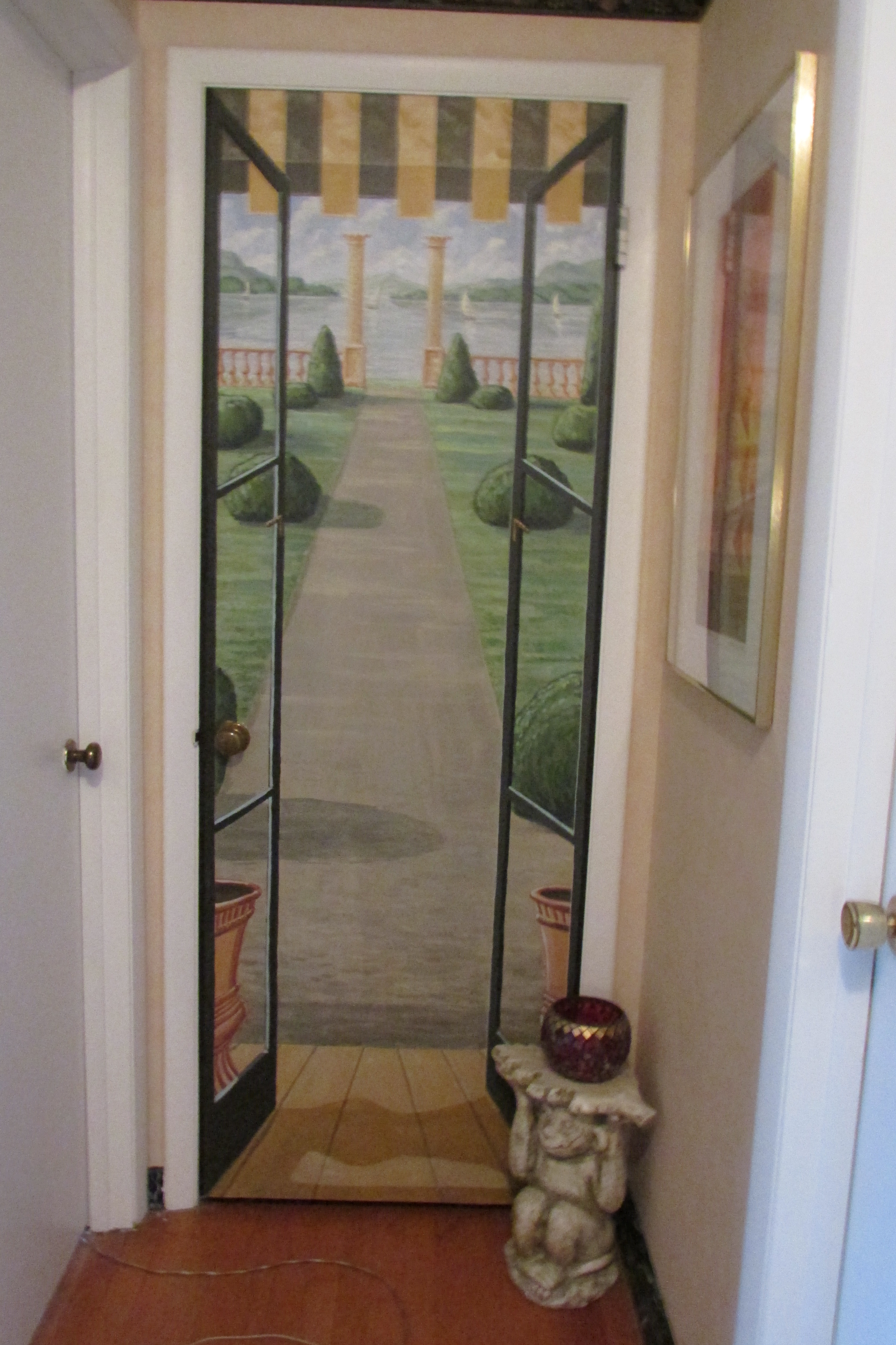 My second mural was the door at the end of the hallway. I wanted to suggest space and openness with a long vistas view that a flat door, no matter what color it was painted, could not offer.