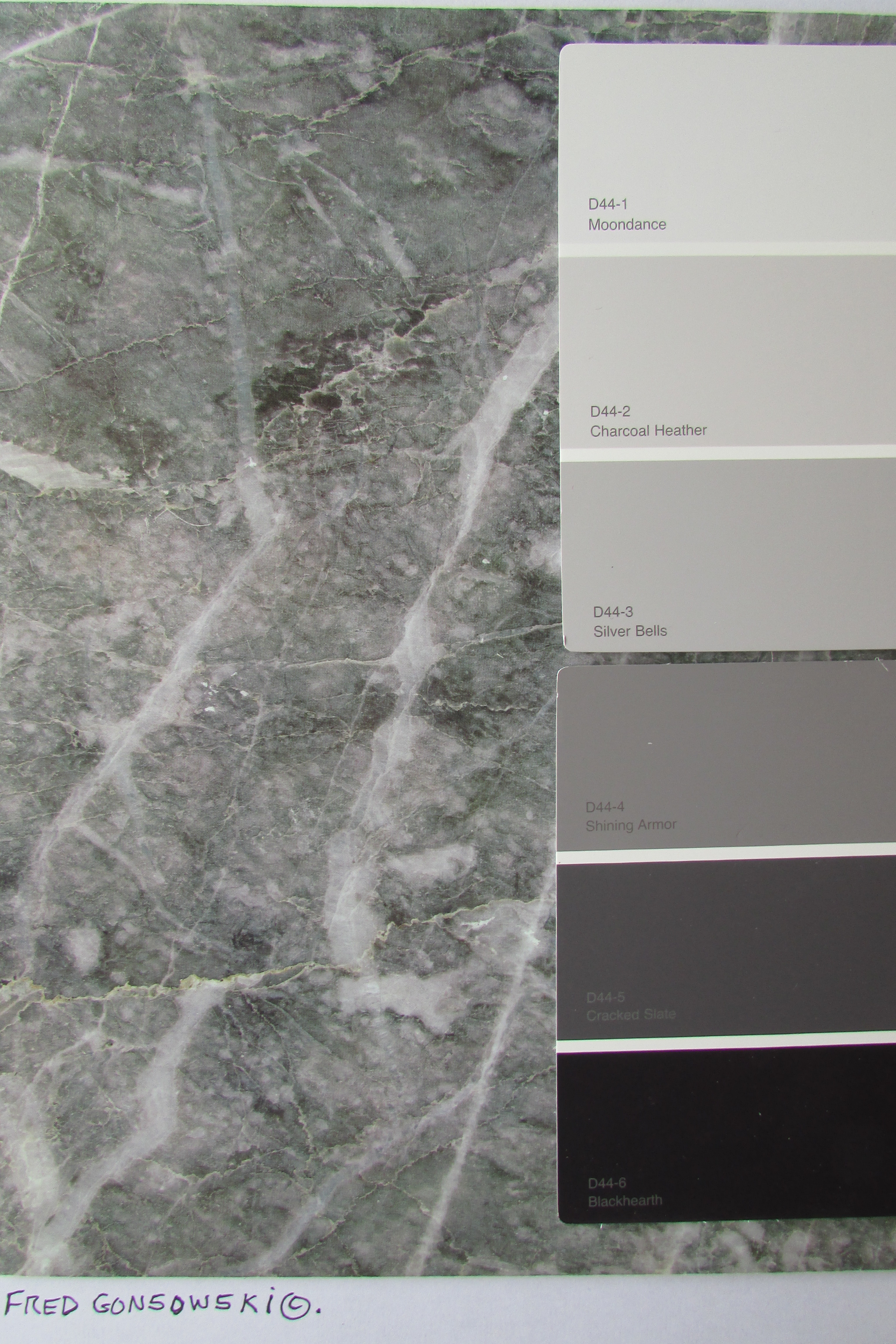Picking the Right Color of Gray… To picking the right color of gray for your home, you should thing about pulling it from an Inspiration Piece. A granite, marble, quartz, Corian or Formica counter top in your kitchen could be a good starting point, or a fireplace front clad in stone, ceramic or marble is another. If you have gray as part of your house’s color story, as seen on upholstery or drapery fabric, patterned carpeting, a large painting with many different shades of gray on it, or even painted wood furniture you can start from there.