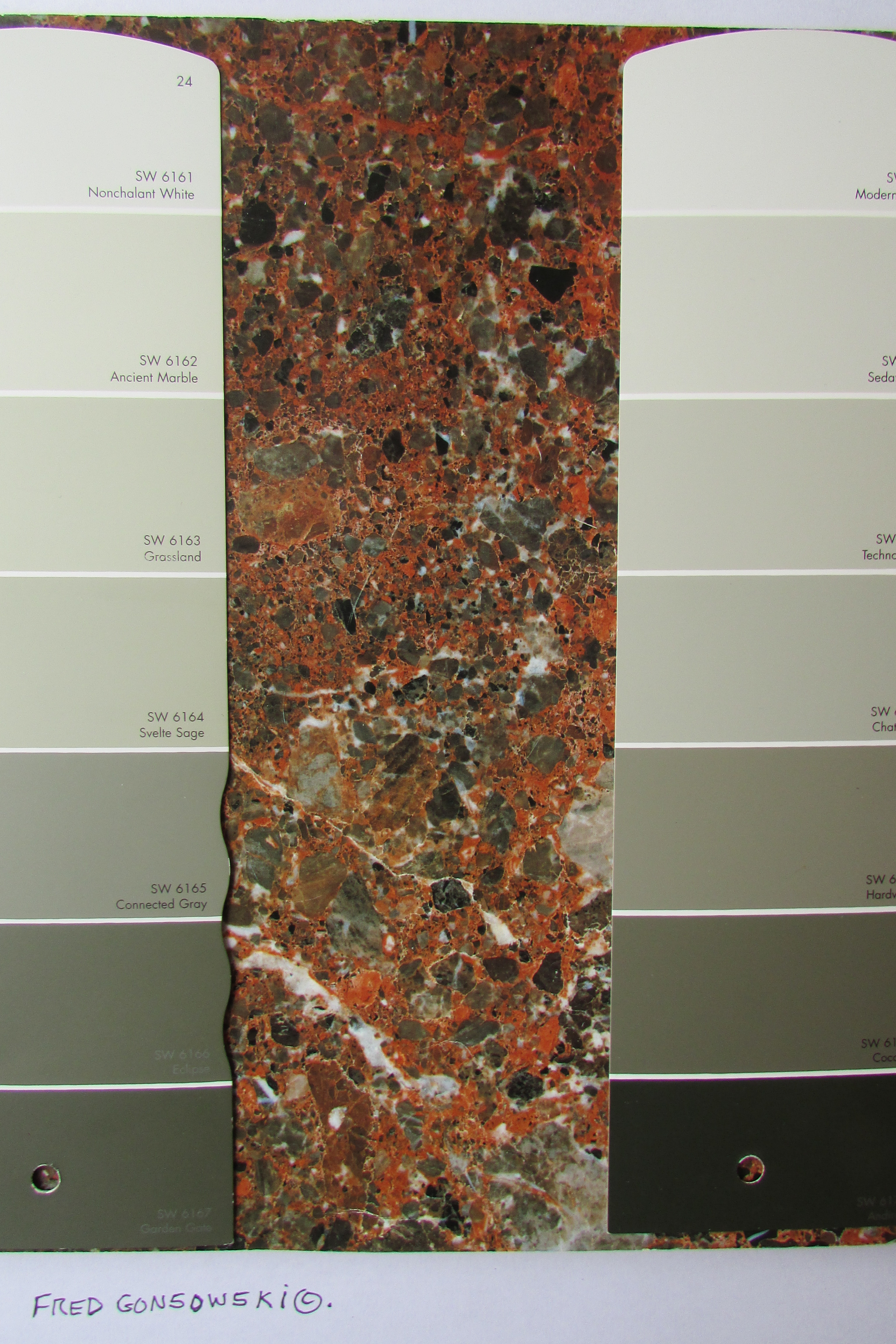 This stone sample, which I don’t know if it is marble or granite, has a lot of gray, gray-green and gray-violet colors in it. The paint samples that I put next to it show a gray that has subtle green undertones. If you look closely at the darkest colors on the stone, the darkest shade on the paint color strip almost perfectly matches the color on the stone. The lightest tint on this paint color strip is very close to the veining on the stone. Any of the colors on the paint color strip would be perfect for wall colors, as they compliment the stone which is the inspiration piece /focal point.