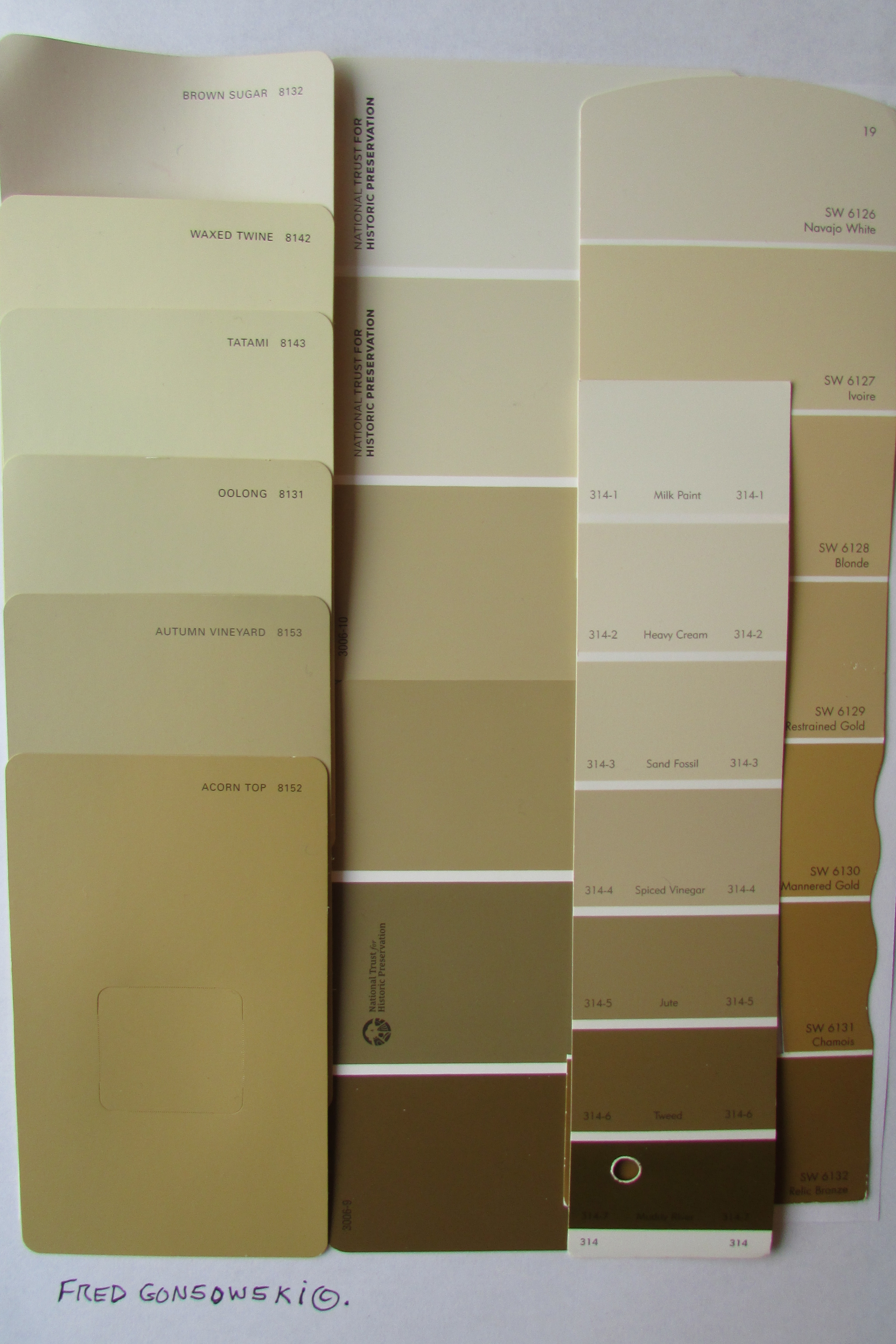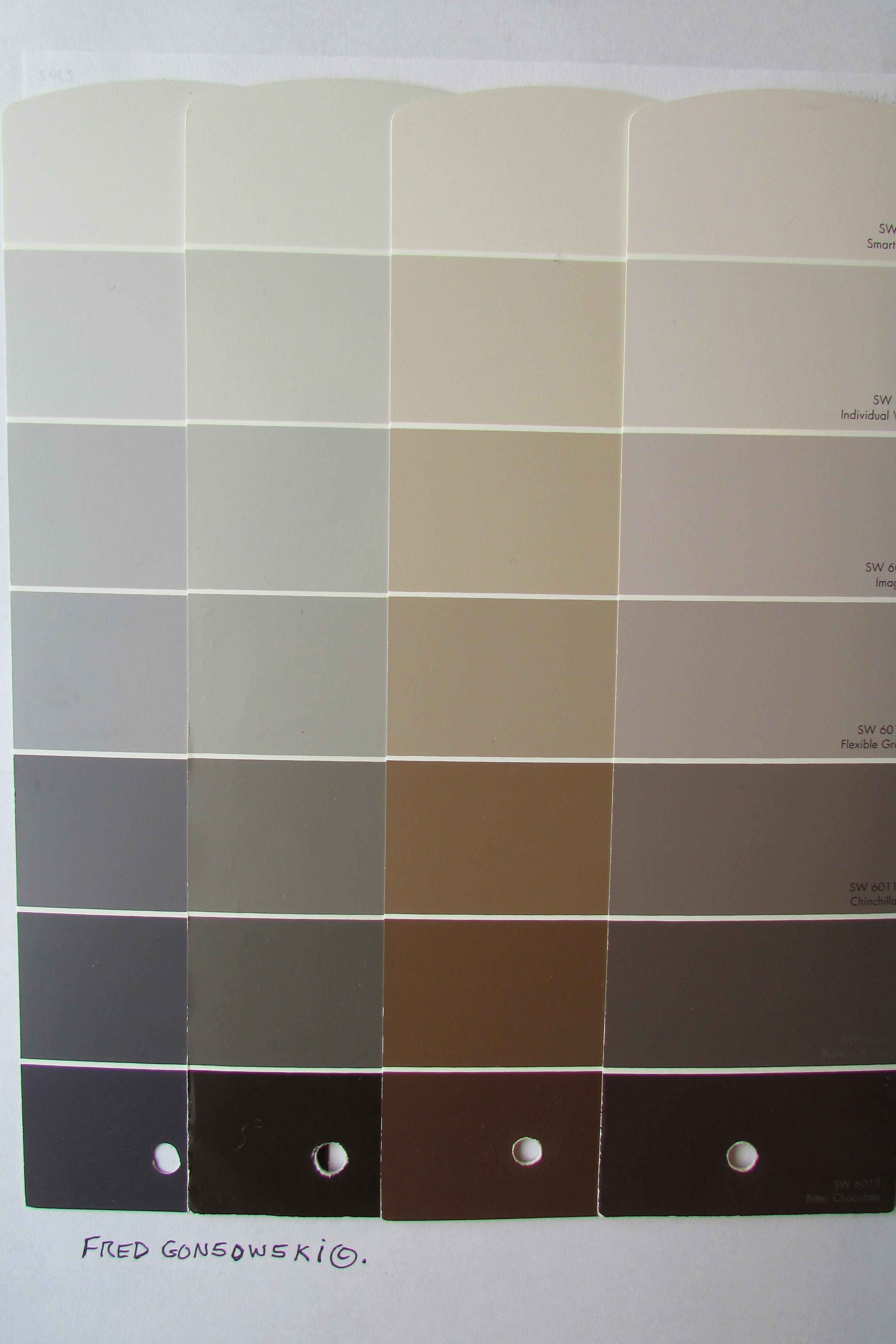 Now let’s look at some paint color strips showing some popular neutrals. IMG_0067 The First visual shows many different shades, tones and tints of the color Gold. Gold is probably the number one neutral color used / found on upholstery and drapery fabrics, wallpapers and patterned carpeting. IMG_0077 The second visual shows four paint color strips. Two different sets of shade, tones and tints of the color Gray are on the left, and two sample strips of Taupe are on the right. Taupe is a gray-beige color.