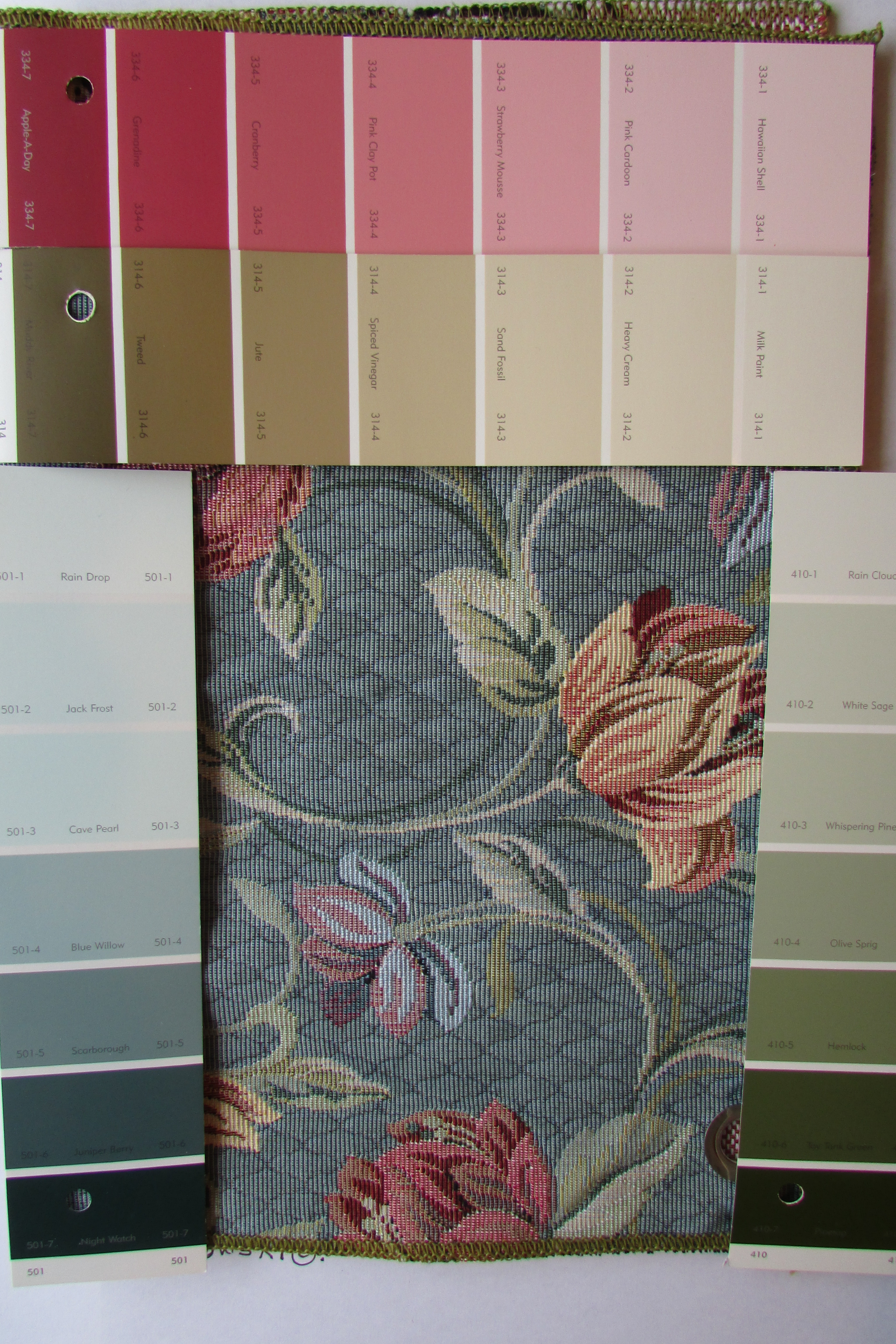 IMG_0085 The above fabric sample is a perfect example of a an inspiration piece. The fabric is a grayed blue-green, which has yellow / golden undertones. The green part of the blue-green says yellow / gold was added. The four paint color strips surrounding the fabric sample show shades, tone and tints of the colors seen/ pulled from the fabric. Any of the lighter versions of the gold, yellow-green and grayed blue-green would be the perfect neutrals to work with, in your home, if this fabric was something you were using. The darker tones on the strips would be great for accent walls.